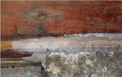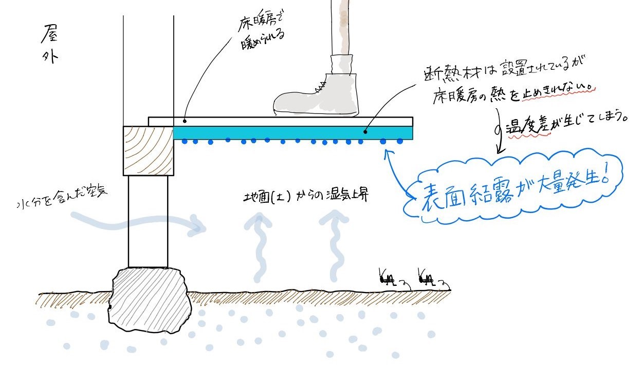 中途半端に断熱材を入れると一年中結露の上で生活することになり、やがてはカビの温床となります。結露の原因は屋外から湿度の高い空気が流入してしまう事と土からの湿気上昇です。水分を多く含んだ空気が床暖房の熱で暖められる事で建物を普及につなげる大量の表面結露を引き起こしていました。