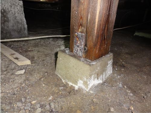 床や柱を支える束の状況です。調査の日はしばらく晴れの日が続いていましたが、束表面は濡れている状態。長年の結露に晒されて金物は錆び、土台と基礎が接する部分にはカビが大量に発生していました。