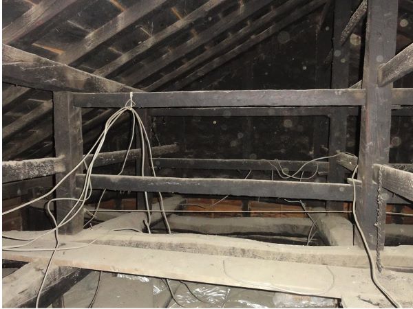 雨漏りの有無や構造躯体の劣化状況を確かめます。ホコリとすすで構造躯体が真っ黒になっています。昔の建物は構造図がありませんので、天井裏に潜り、構造躯体がどのように掛かっているのかを確認し、構造補強計画を行います。
