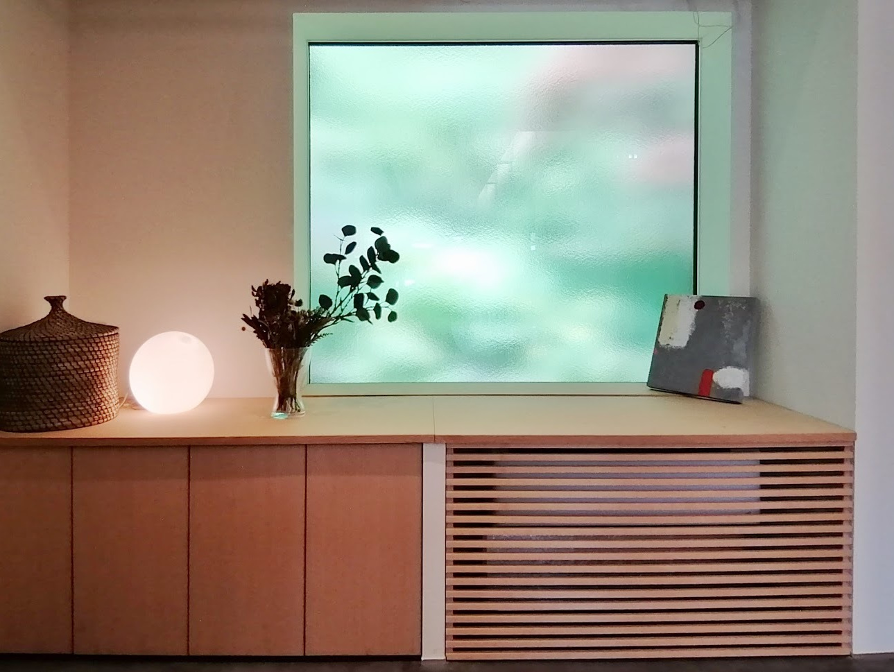 リビングスペース奥にはパッシブ冷暖の本体が設置されています。エアコン1台で床下全体を暖めるシステムです。収納横のガラリ内部にエアコン本体を設置しています。