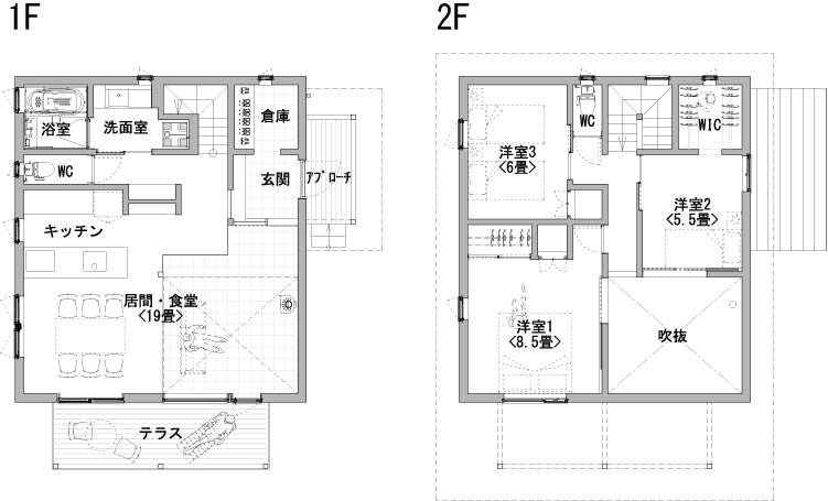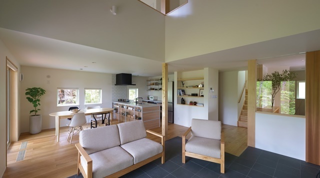 約100㎡と比較的コンパクトな建物ですが、動線に深慮して広いところ、狹いところ、高いところ、低いところ、明るいところ、暗いところといったように緩急の変化をつけることで居場所が生き生きと浮かびあがり、コンパクトな家でも廊下の面積を極力抑えて広々と感じる家にすることができます。