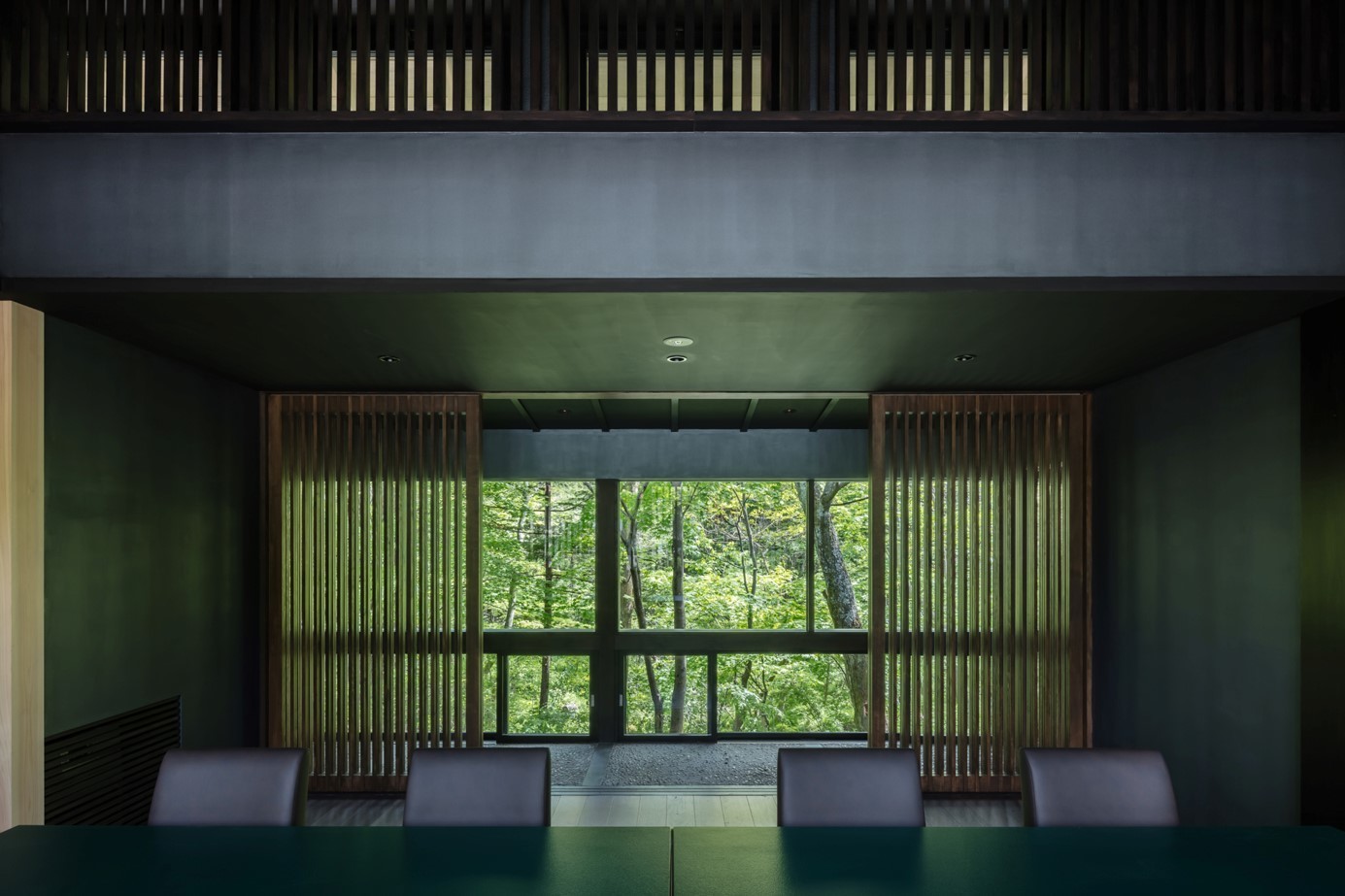 壁は長野県松本城の黒漆喰をモチーフに、黒く、景色が際立つように設計。