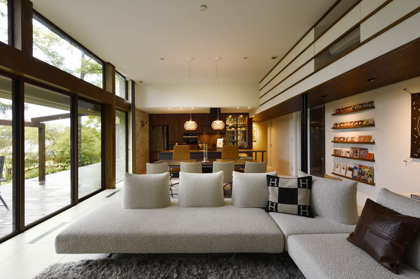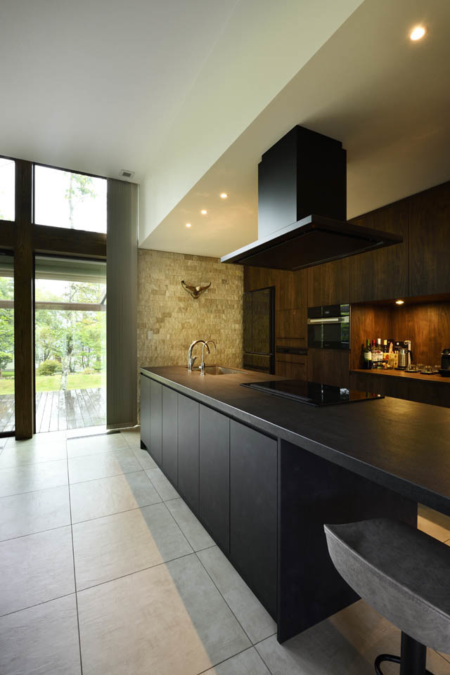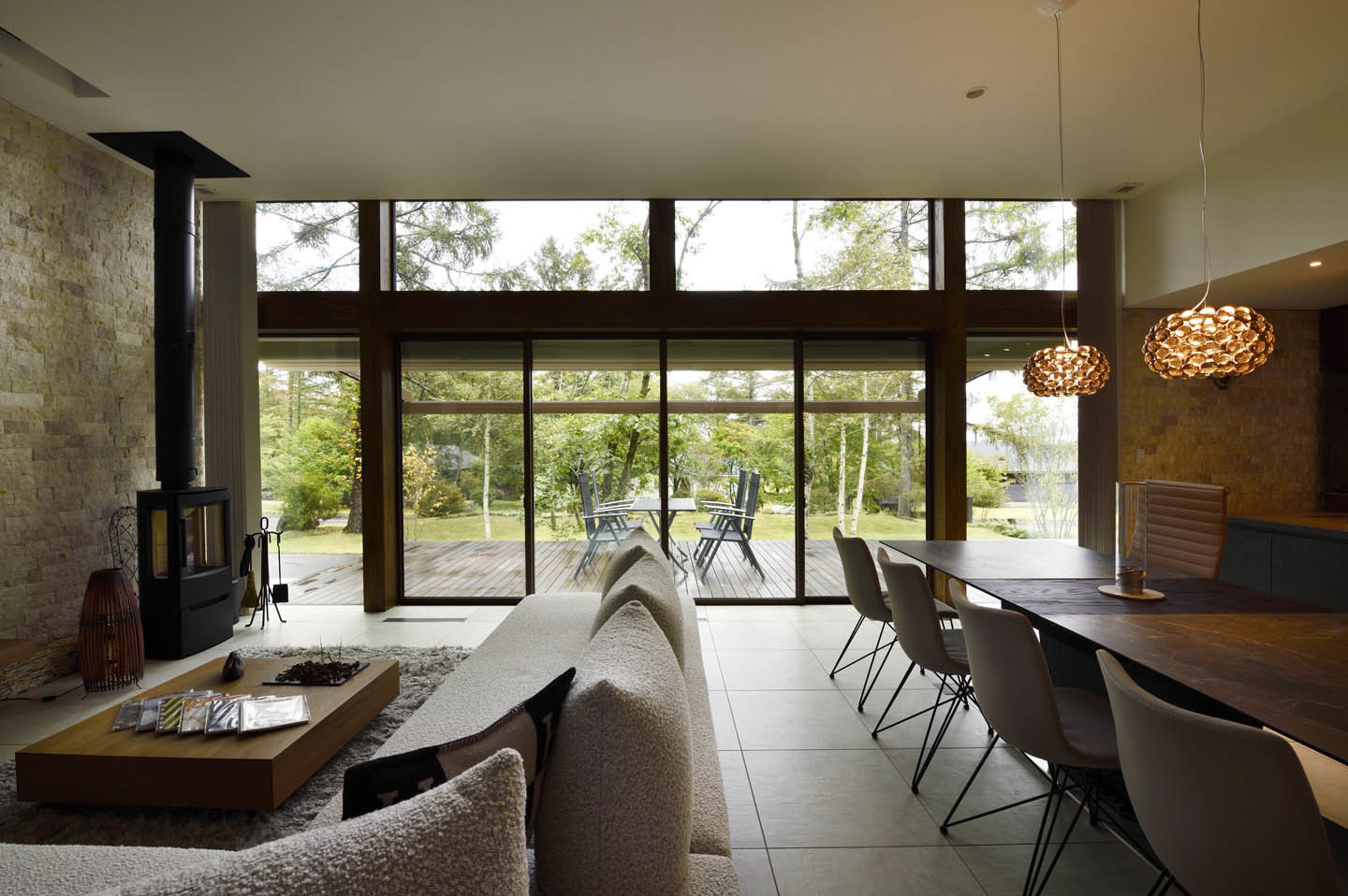 開放的なリビングでありながら、断熱等級は6を実現しており、開放感と快適性を両立した別荘建築です。