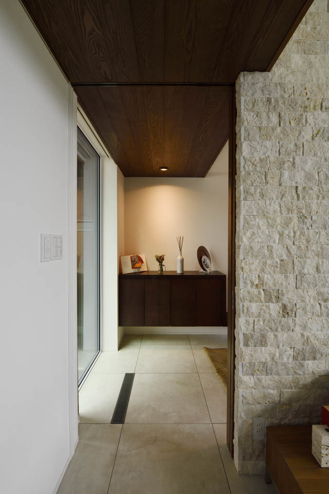 リビングへの入り口は型ガラスで造った引き戸を採用。