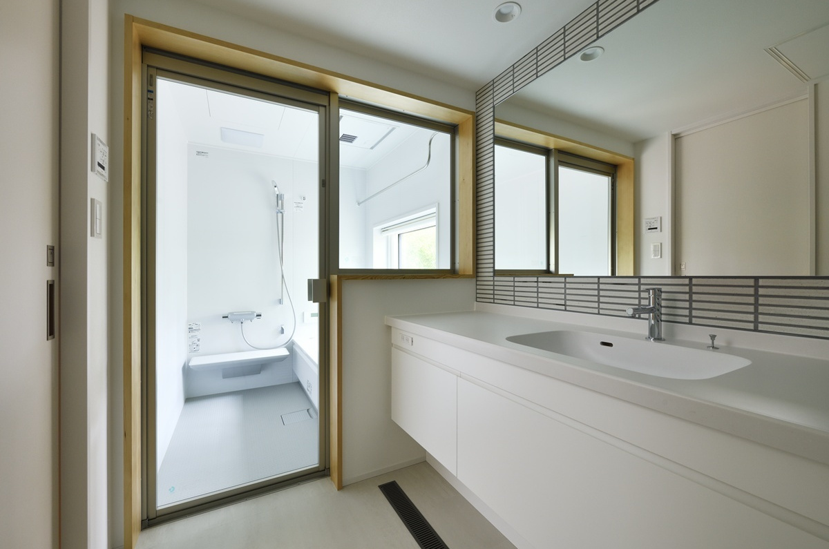 洗面化粧室は、FIXガラスで繋がる浴室と合わせ、開放的な空間を実現。自然光がたっぷりと降り注ぎ、リラックスできるひとときを演出します。