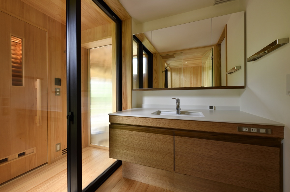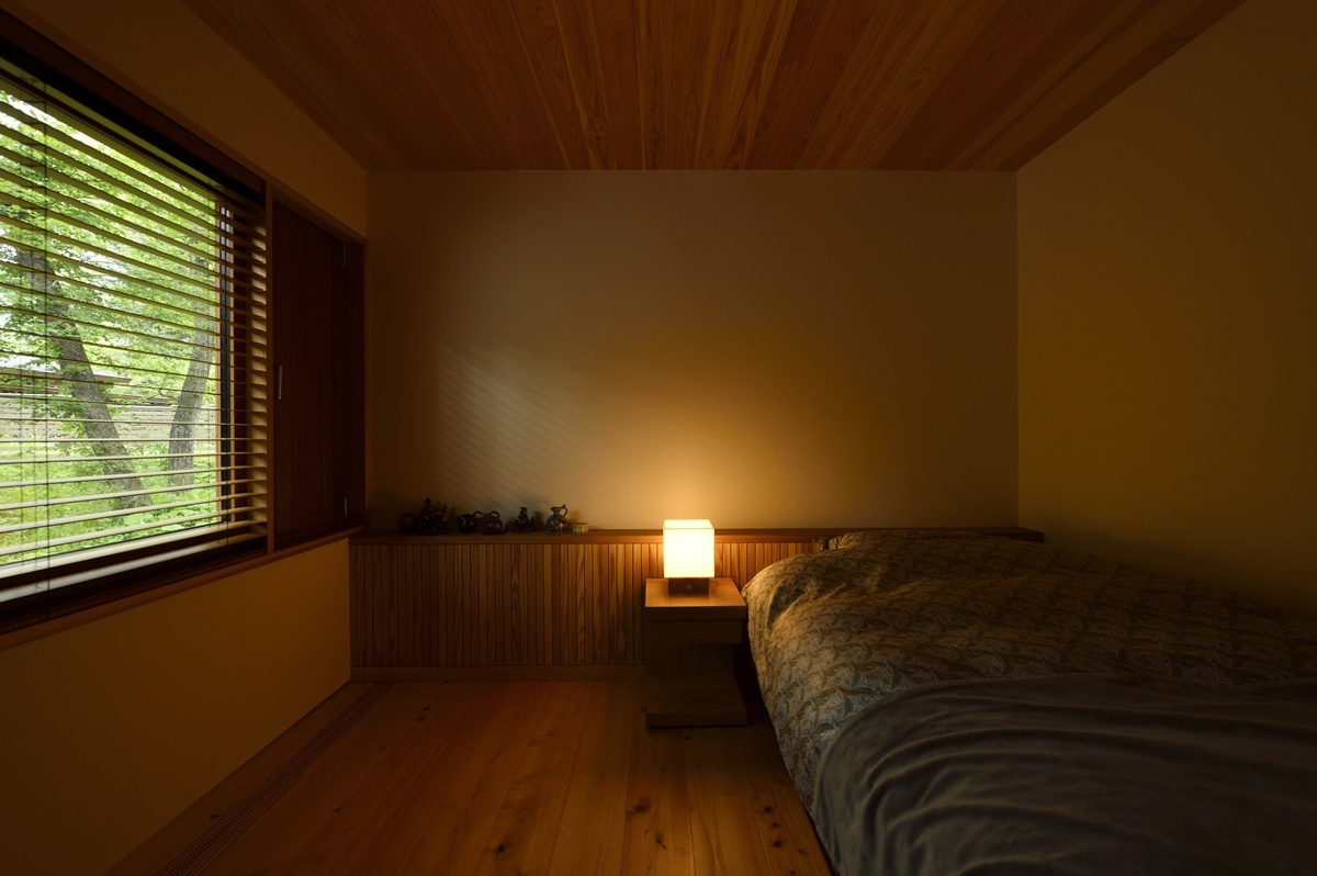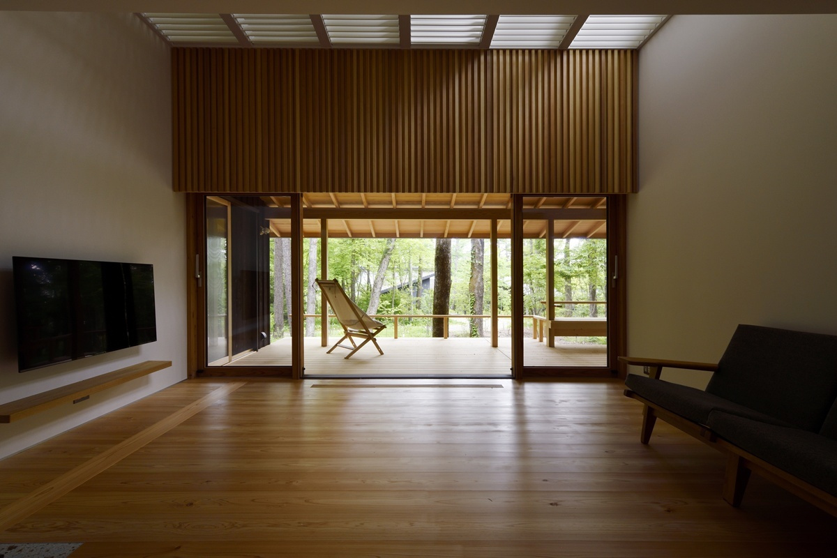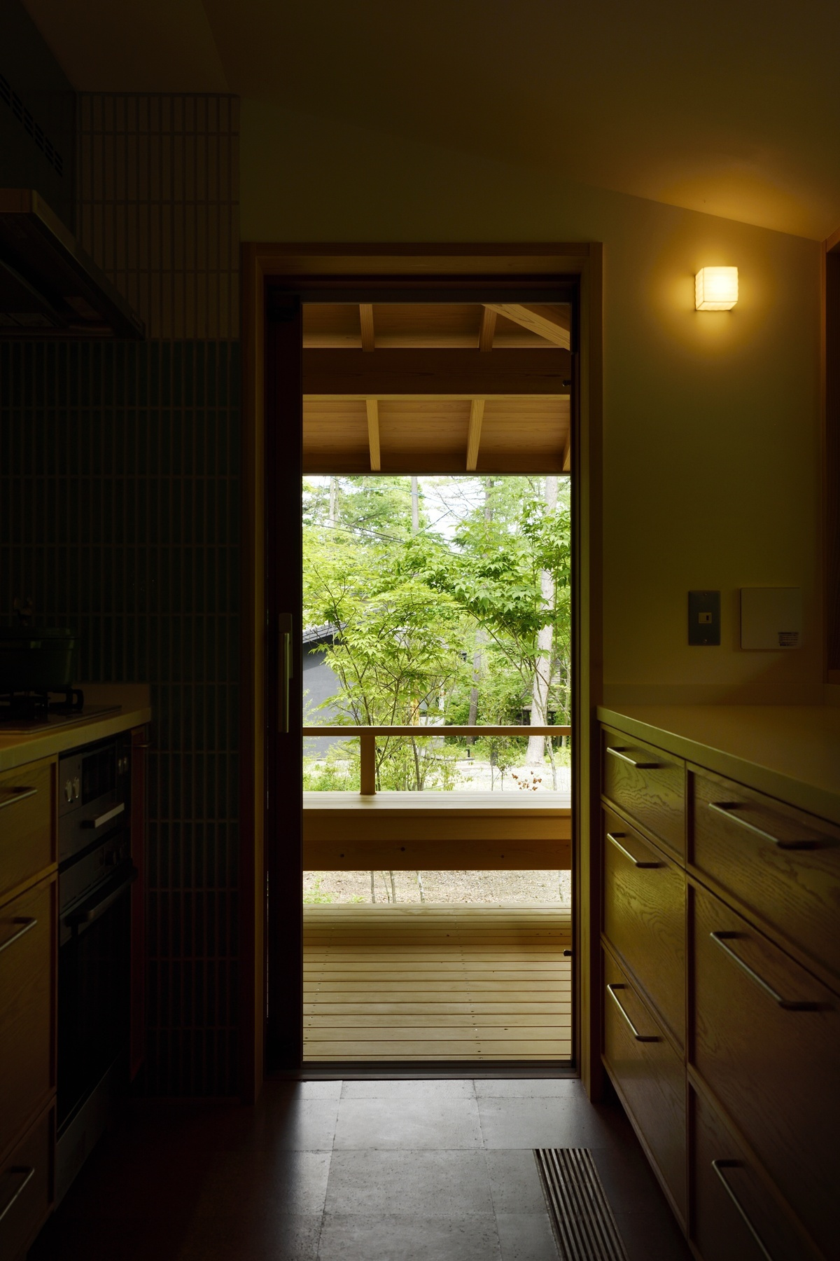 家族や友人と食卓を囲むことが出来るよう造り付けのベンチコーナーが設けられており、朝食を鳥のさえずりの中で楽しんだり、秋の夜には虫の合唱に耳を傾けたり、季節の移ろいを肌で感じ、晴れた日には太陽の恵みを、雨の日にはしっとりとした自然の表情を、五感で味わうことが出来る空間です。