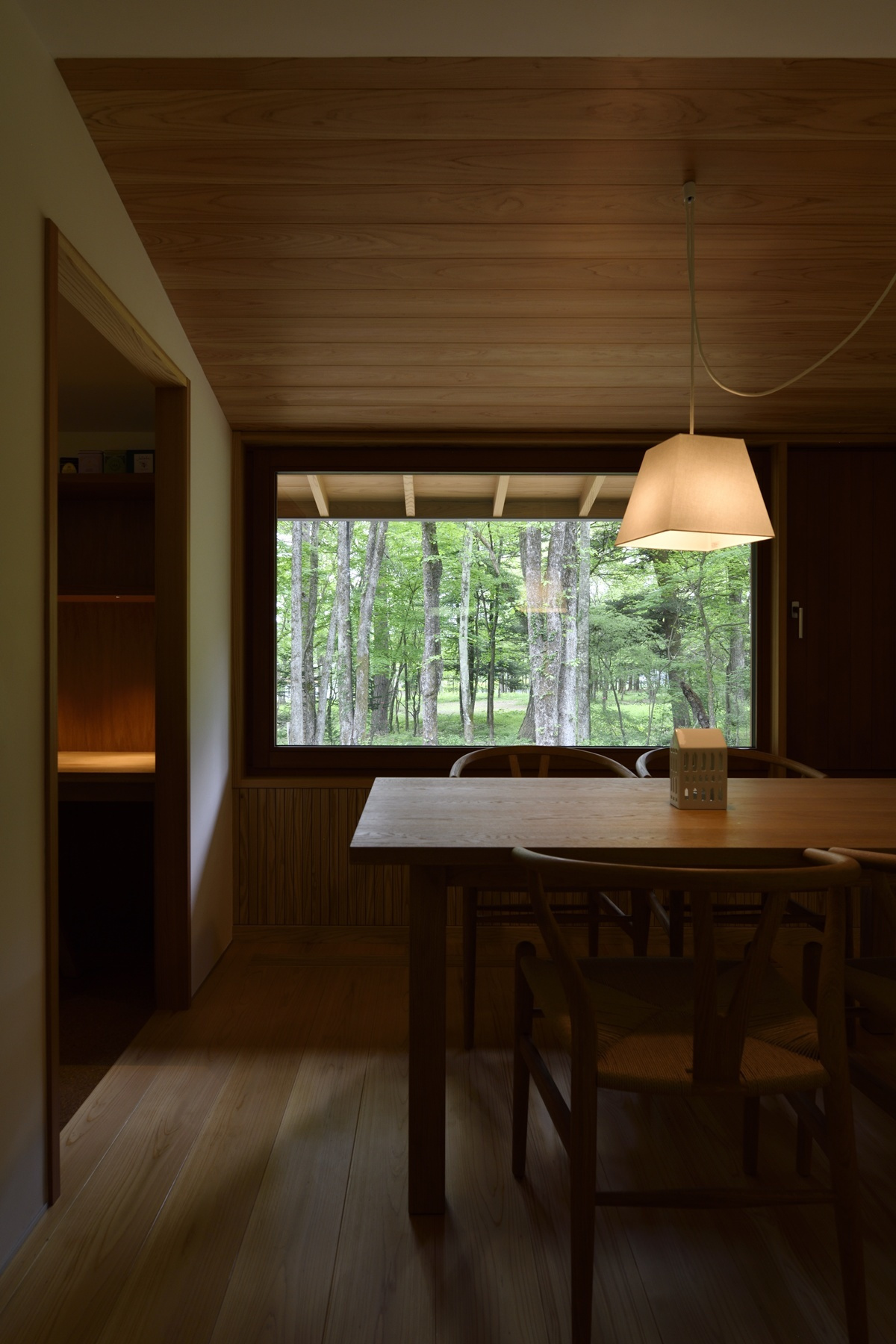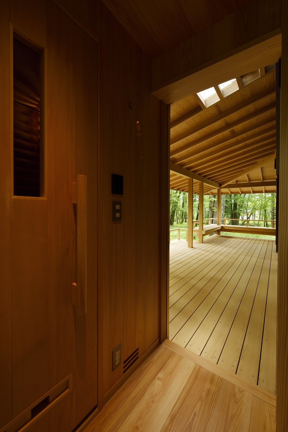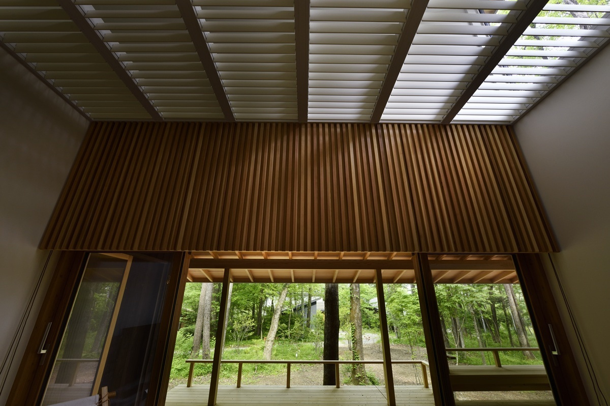 家族や友人と食卓を囲むことが出来るよう造り付けのベンチコーナーが設けられており、朝食を鳥のさえずりの中で楽しんだり、秋の夜には虫の合唱に耳を傾けたり、季節の移ろいを肌で感じ、晴れた日には太陽の恵みを、雨の日にはしっとりとした自然の表情を、五感で味わうことが出来る空間です。