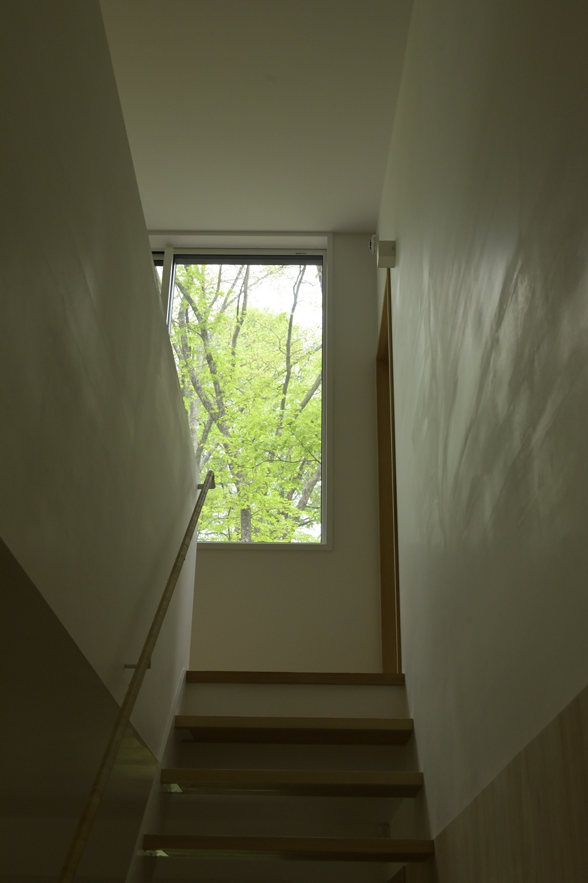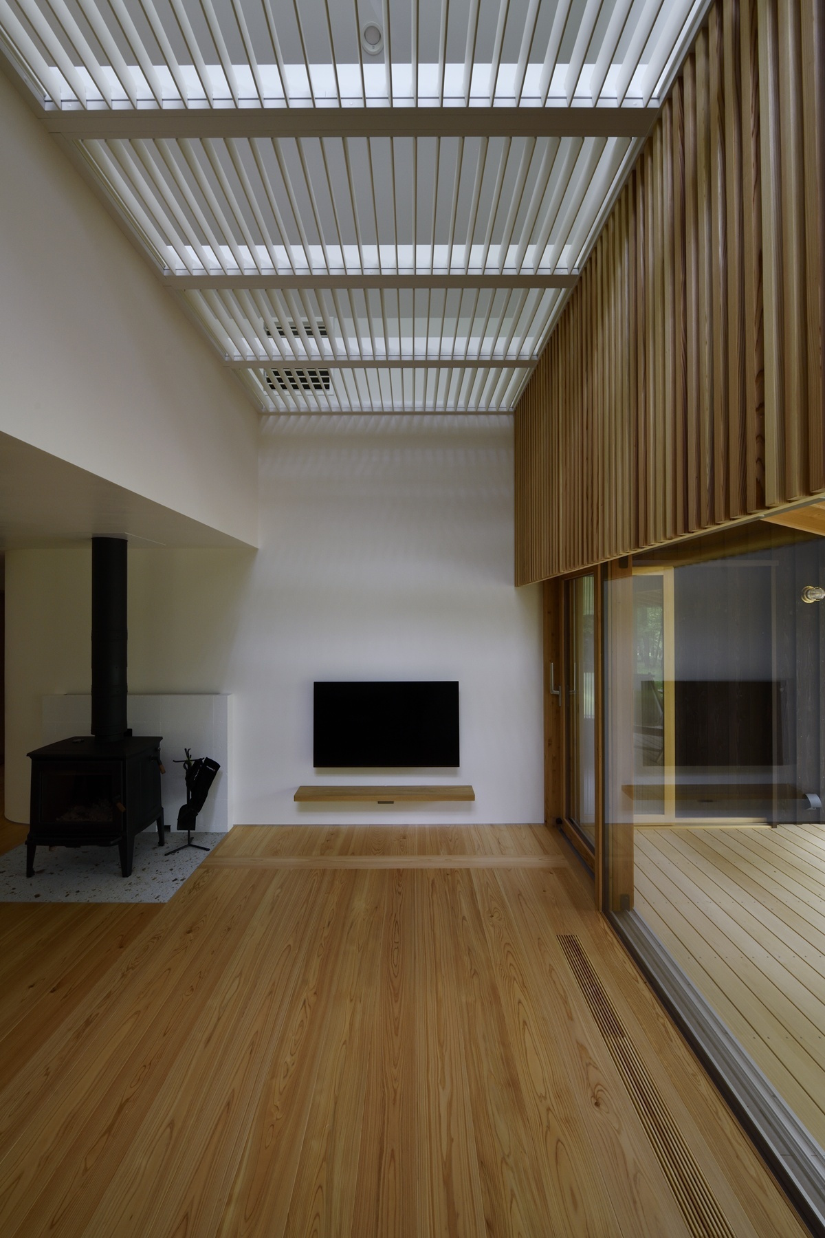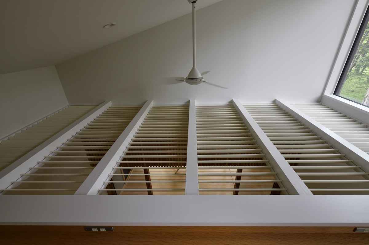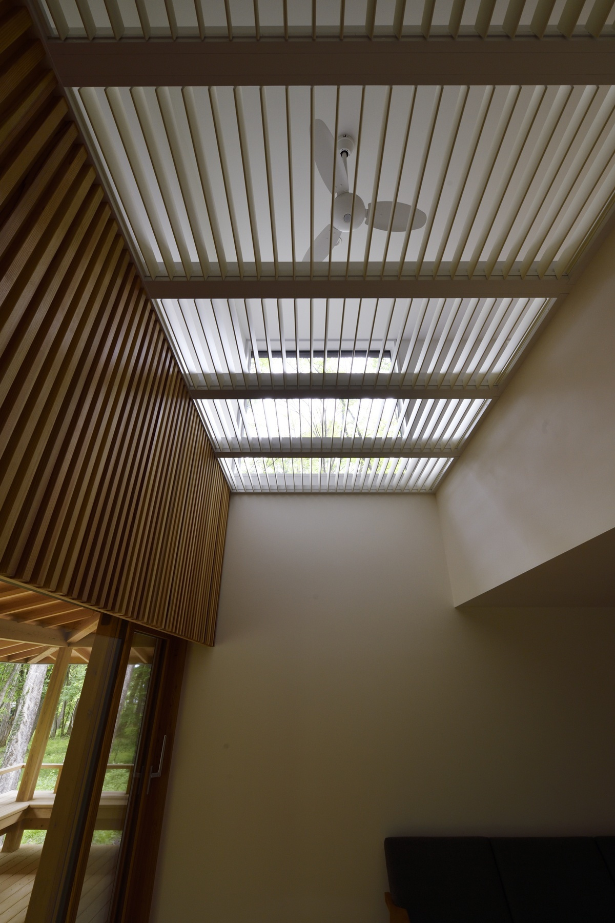 この吹き抜けに設置された”可動ルーバー”は、季節の移ろいに合わせてその役割を変える、この住宅の温熱効率の要となっています。