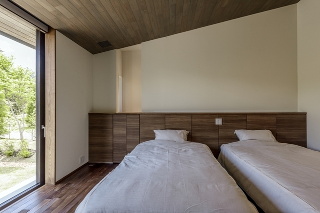 床高さを地面から1メートル程に設定した主寝室からは庭を見下ろすような眺望。