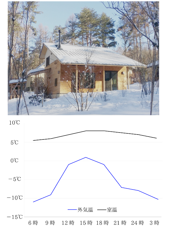 冬期不在時の実測値データです。外気温は夜明け前に氷点下10℃を下回り、日中はわずかに0℃を上回るものの、ほぼ1日を通して氷点下の外気状況となります。まさに過酷な寒冷地ならではの状況です。室温は、凍結防止の為に少しだけ暖房を予備運転しているだけですが、室温のグラフは5℃を下回ることがありません。別荘に向けて出発した時に遠隔操作で暖房の運転を開始すれば到着するころにはしっかり暖まった状態が実現できます。