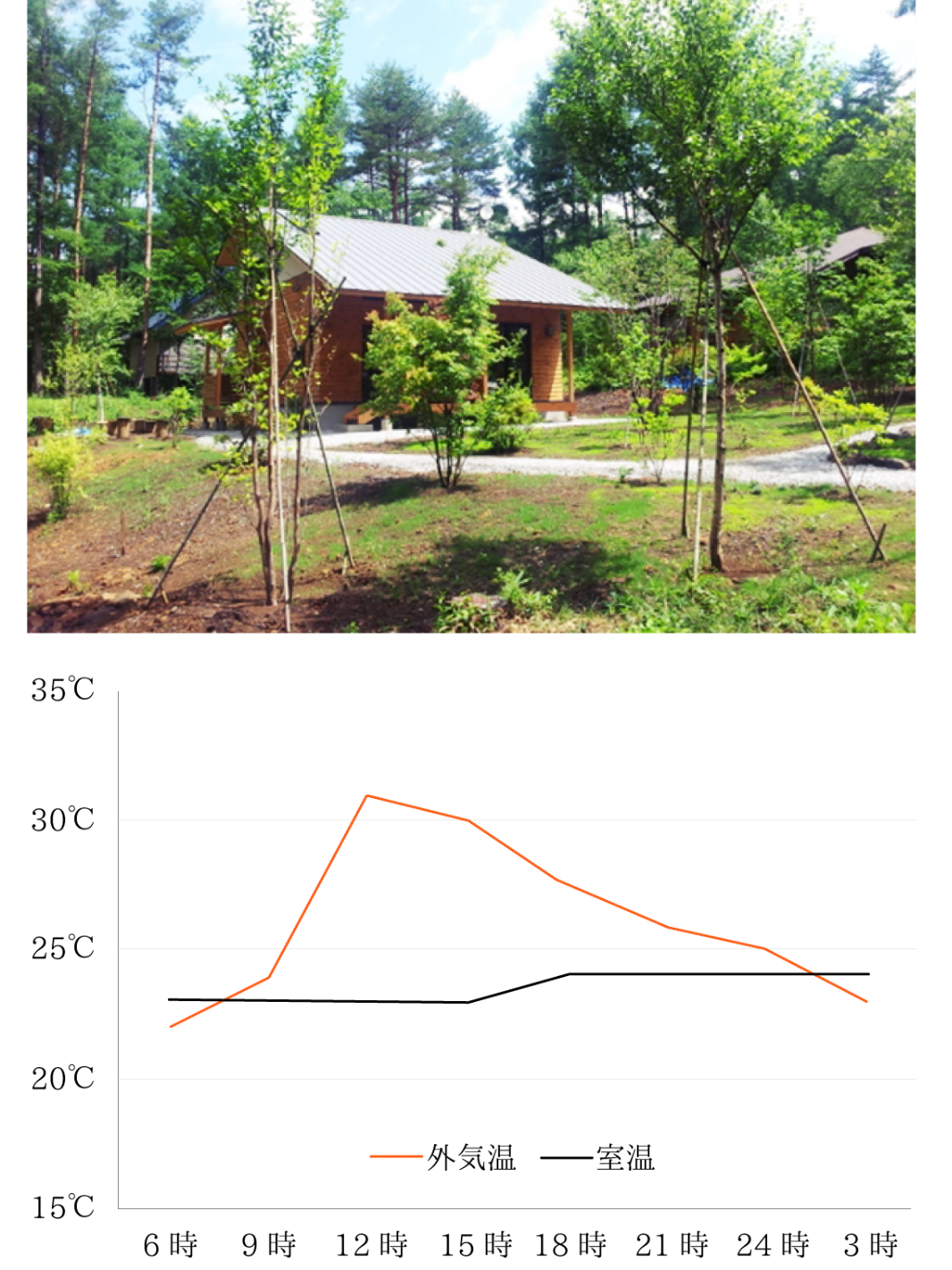 こちらは夏の実測データです。正午頃には外気温が30℃を超えていますが、点線の室温は23℃程度でほとんど上下せず、一定した室温を保っています。冷房器具等は一切使用していない自然室温です。夜間も寝苦しくなく、高原の夜風を感じながら心地よくお過ごし頂けます。