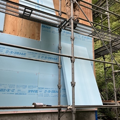 断熱材施工完了後シートを張り、2階の天井下地を組んでいます。 玄関ドアを取付けました。外壁の仕上がり位置を元に左右と高さの位置を調整してしっかりと固定します。 外貼り断熱も進んでいます。外壁全面に貼り付け、防水気密テープを全ての隙間と木部に貼り付けます。 床下の断熱を施工しました。厚い断熱材を隙間なく全面に敷き込んでいます。床束周りにも断熱材を充填しています。 屋根板金屋根板金を取付けています。 破風(はふ)破風板を取付けています。斜め破風です。 2層目垂木屋根として見える2層目の垂木と野地を施工しています。 屋根断熱1層目の屋根の上に屋根断熱を敷き詰め、防水気密テープで隙間なく止めていきます。 1層目垂木(たるき)1層目垂木を並べ、野地板を敷いていきます。 建て方(たてかた)建て方の様子です。建物の大きさが見えてきました。 足場仮設足場を建てました。 材料プレカットされた構造材が搬入されました。 基礎完了外周を埋め戻して基礎工事が完了しました。 立上り部分を打設しました。 立上りの型枠を組みました。 ベースを脱型し、立上り部分の枠を組むための墨を出していきます。 ベースを打設しました。 基礎の鉄筋が組まれました。 捨てコンに墨を出し、ベースの枠を組んでいます。 捨てコンを打設しました。 墨出しに必要となる捨てコンクリートを打設するための枠を設置しました。 砕石を敷き、転圧して締め固めます。 基礎工事が始まりました。 基礎工事の段取りが始まりました。測量で出した建物位置を基に丁張を設置していきます。 杭頭処理の様子です。指定の高さで均して仕上げます。 杭打ちの様子です。直径60cmの杭を着々と打っていきます。 試験杭箇所の打設深さを確認しています。調査通りの深さに支持層があるかを確認し、打設を開始しました。 試験杭を打っています。今回はくし兵衛工法というコンクリート杭を打設する方法で行っています。 測量したポイントを基に杭を打つ箇所に印を設置しました。 地盤改良のために杭打機が入りました。 別荘地の一角に1戸建ての住まいを建てることになりました。傾斜を活かした素敵な住まいになります。 森の階層の家 工事概要SE構法 2階建て所在地:軽井沢町