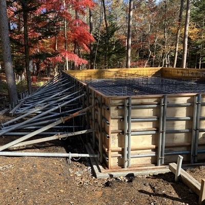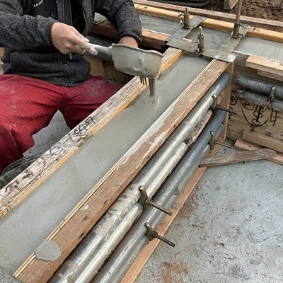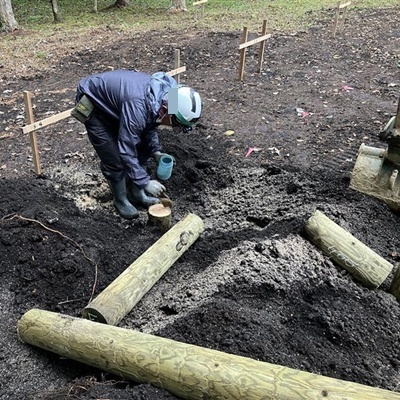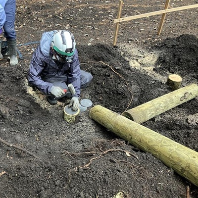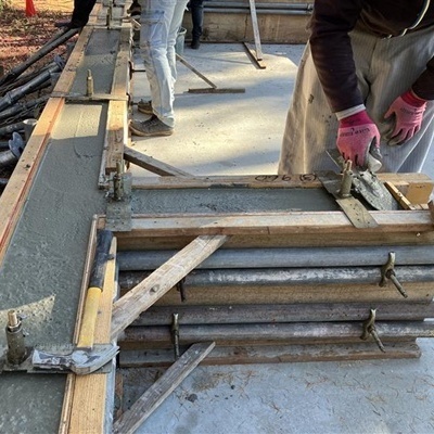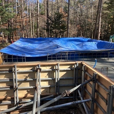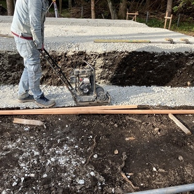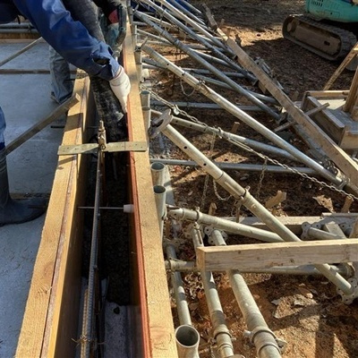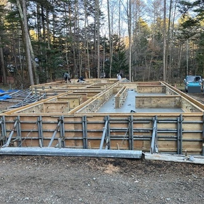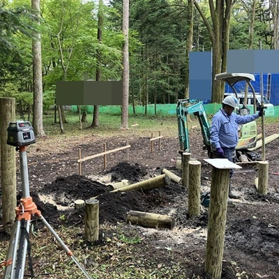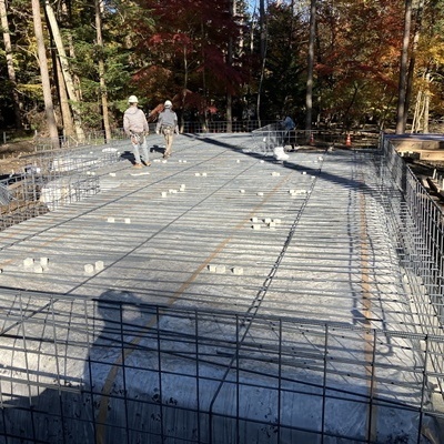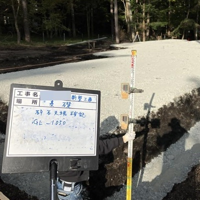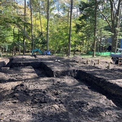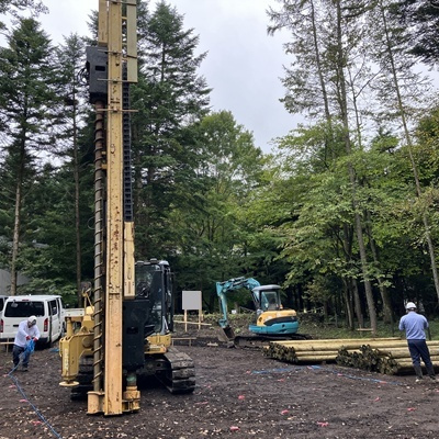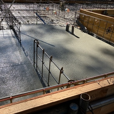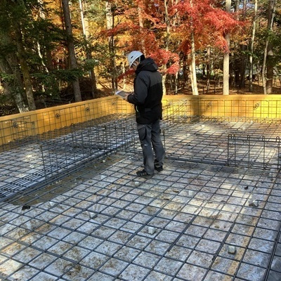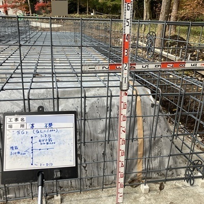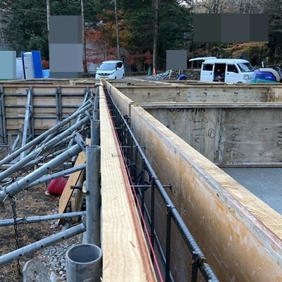 型枠を解体しました。綺麗に打ちあがりました。 打設完了後、養生を行い作業完了です。 立上り部分にレベラーを流し込み平滑に仕上げていきます。 立上りの打設状況です。 立上りの打設状況です。 アンカーボルトの設置を行いました。 基礎の全貌が見えてきました。 立上り部分の型枠作業状況です。 打設完了です。 均し作業が終わった所から、養生の為シートを被せます。 均し作業状況です。 コンクリートの均し作業状況です。 コンクリートの打設状況です。外周面には止水版を設置していきます。 振動機を使いコンクリートを流し込んで行きます。 ポンプ車を使い打設していきます。 コンクリートの受け入れ試験も打設前に行います。 打設前に落ち葉養生を行いました。 型枠の通りを確認しました。 この時期は落ち葉がとても多いので、定期的に清掃して作業を進めます。 外部型枠の建て込み作業が始まりました。 第三者機関の配筋検査を実施しました。 配筋状況の全景です。 スラブ筋の確認状況です。 内周部の配筋状況です。 配筋完了後、太さ、本数、ピッチなどを確認します。 配筋状況です。 外周部の鉄筋から組み上げていきます。 配筋作業が始まりました。 きれいに打設されました。 打設をしながら、平滑に仕上げていきます。 捨てコンクリートの打設を行いました。 転圧完了後、防湿シートを敷きました。 転圧が完了しました。 転圧後の高さ確認です。 転圧の施工状況です。 砕石部分に転圧を行います。 砕石を敷きならべています。 根切底の確認をしています。 杭も図面通りの位置で確認できます。 外周部の地中梁部分を掘り進めていきます。 基礎工事に着手しました。 杭工事が、完了しました。 杭の高さを確認しています。梁部分、スラブ下部分で、高さの高低差があります。 打設後、杭の高さを確認していきます。 施工機のモニターにて、深さ、圧力等を管理していきます。 杭天端に、鉄板を設置します。 杭が支持層まで到達したのち、切断して防腐処理を行います。 杭の打設状況です。 杭芯に合わせて杭をセットします。 杭の施工機の全景です。 杭の材料が、現場に納品されました。 杭工事に先立ち、杭の位置出しを行いました。 敷地の整地が終わりました。 伐採後、伐根作業に移ります。 伐採した木を丸太にして搬出していきます。 伐採状況です。 工事に先立ち伐採工事を開始しました。 林間のモダンスキーム 工事概要在来軸組工法 平屋建て2025年9月着工 2026年5月竣工予定所在地:軽井沢町