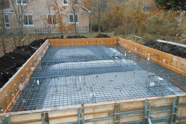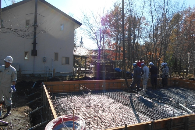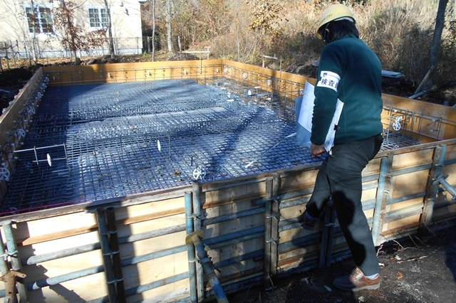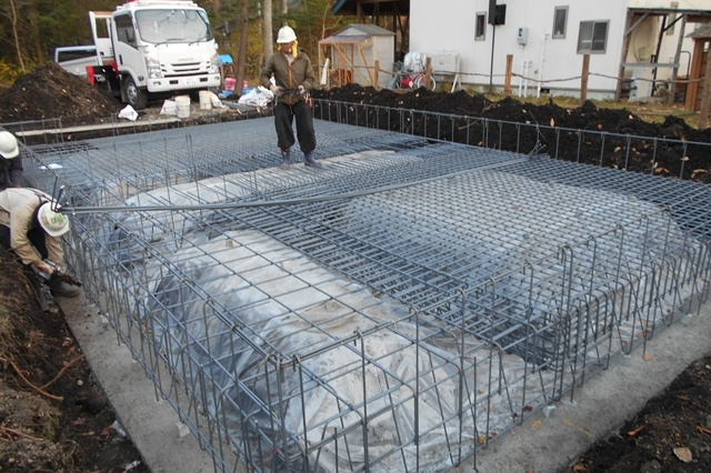 基礎配筋を施工しています。工場で予め製作してきた鉄筋を図面通りに並べ、固定していきます。鉄筋のピッチや太さ、本数なども全て設計段階に構造計算によって決められています。手際よく、あっという間に組み上がります。