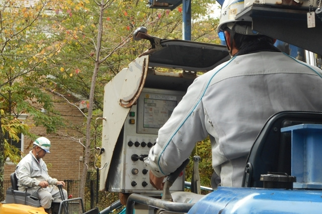 キリンを操縦している職人さんは、特殊な機械を使うことで計画通りに工事が行われているかをチェックしています。その鋭い視線に、緊張感が走ります。。寸分の狂い無く予定通りに工事が進んで行きます。