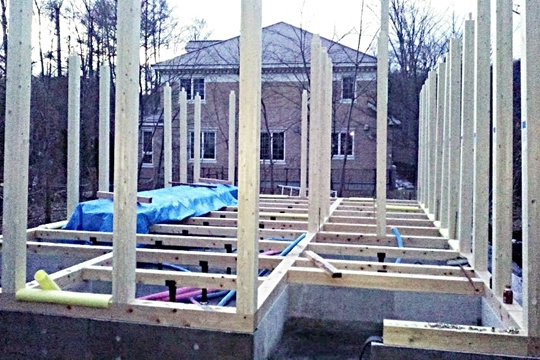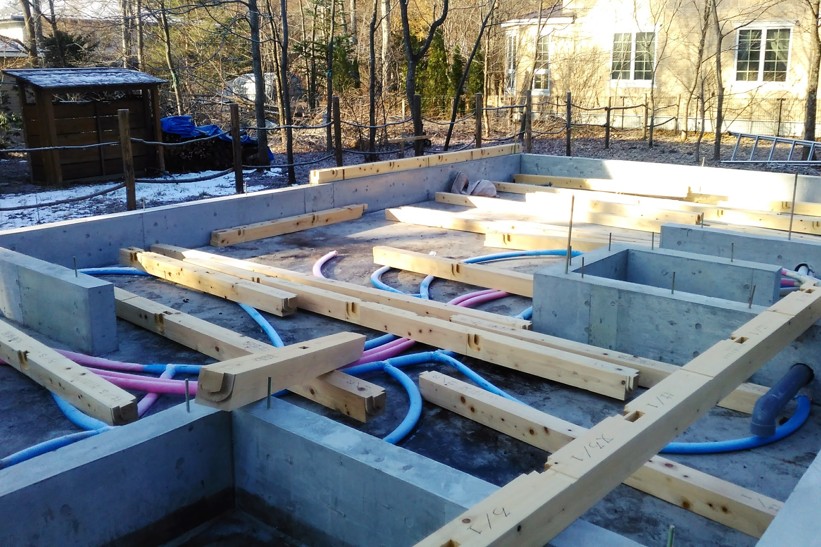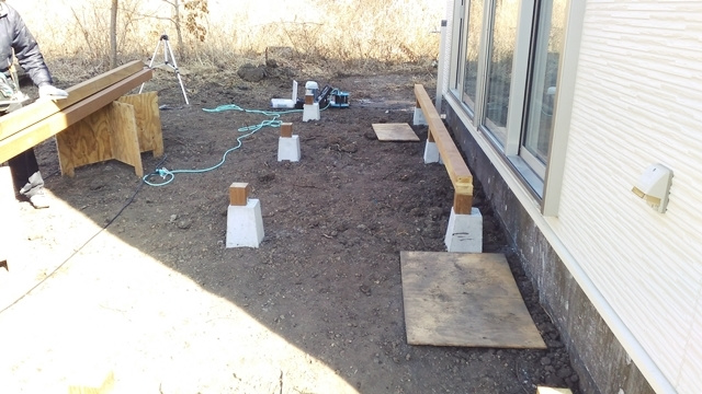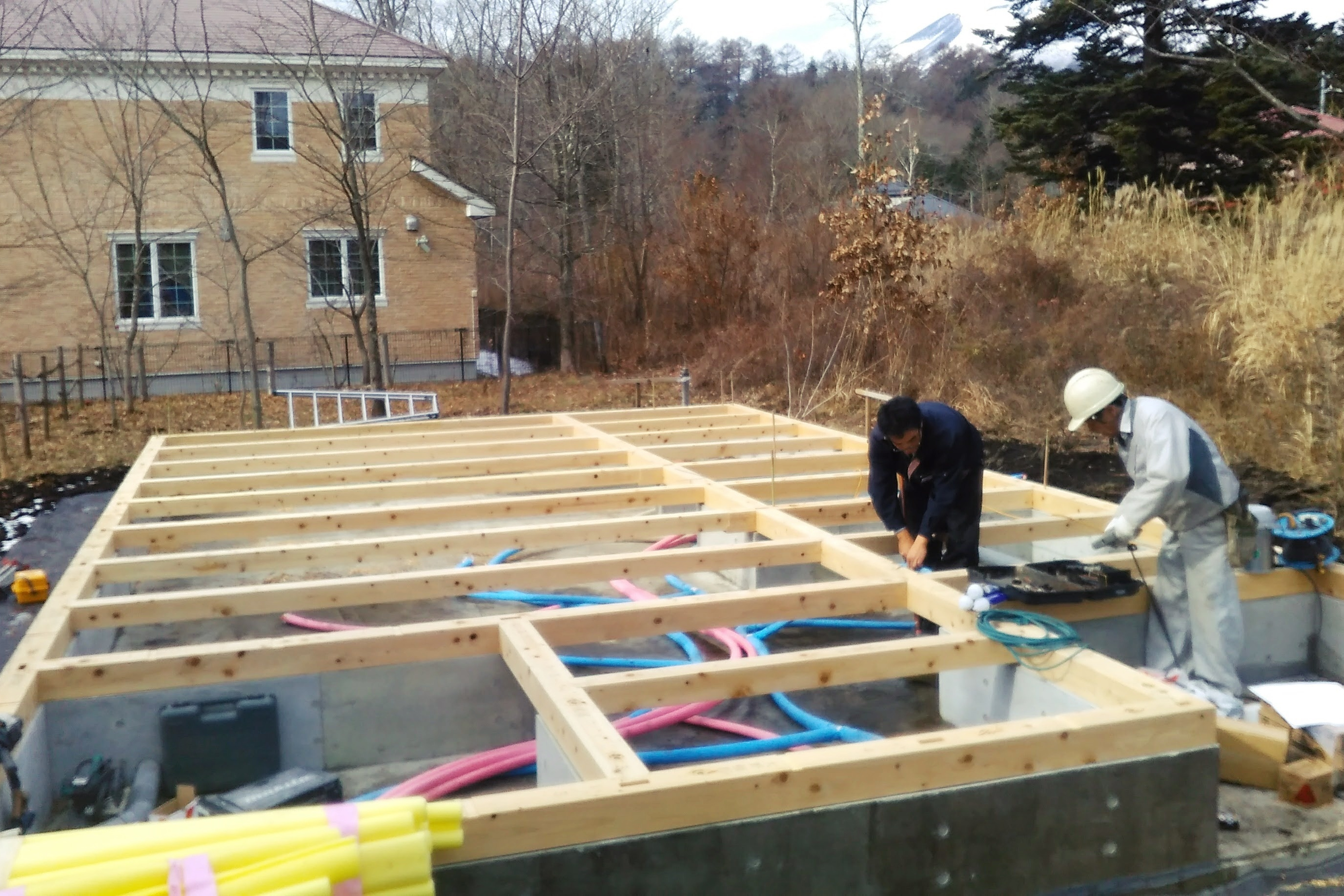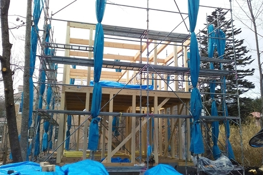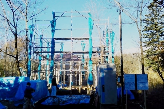 土台敷き工事が概ね完了となりました。この後はいよいよ建て方工事と呼ばれる、柱や梁を組み上げる工程に進みます。あっという間に組み上がり、建物の骨組みが姿を現します。最終点検と確認を終えまして、本日の作業は完了です。気温はようやく0度になりました。