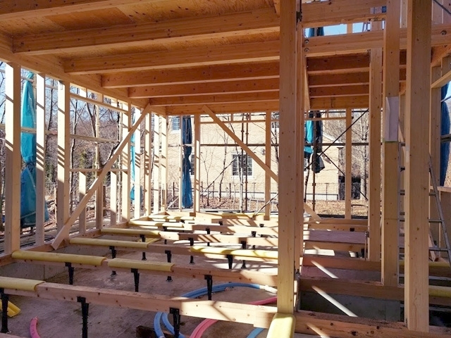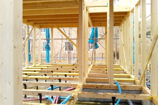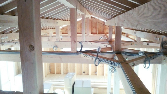 大工さんの休憩中に1階に入ってみました。綺麗に組まれています。斜めに取り付いている材料は、柱と梁の水平垂直をキープしておく為の仮筋交いと呼ばれる材料です。工事が進むにつれて、少しずつ外れていきます。