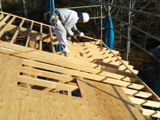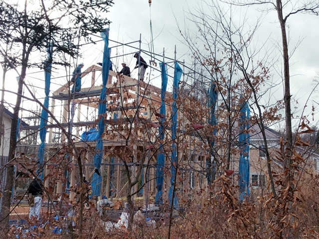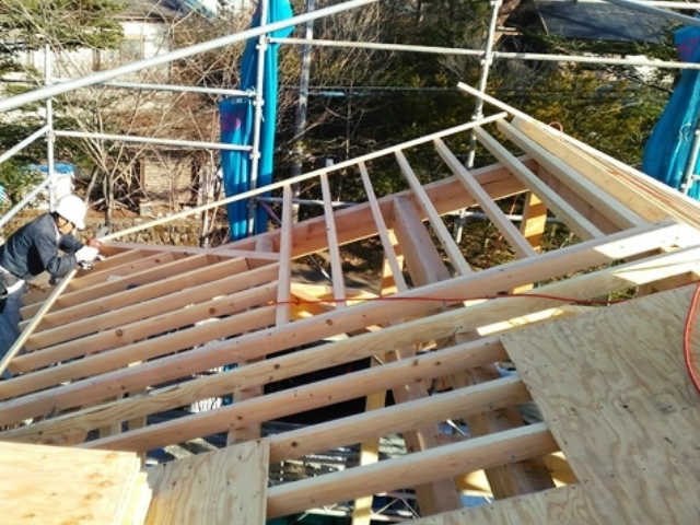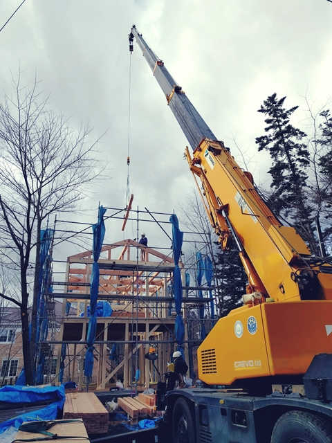 屋根の一番上に設置する、”棟”と呼ばれる材料をクレーンで持ち上げています。文字通り、棟上げの瞬間です。クレーンを操作する職人さんと、材料を受け取る大工さんがあうんの呼吸で作業を進めています。