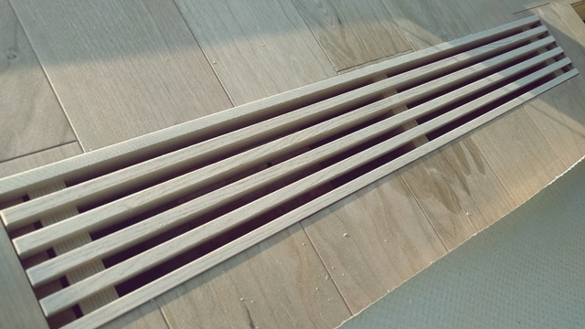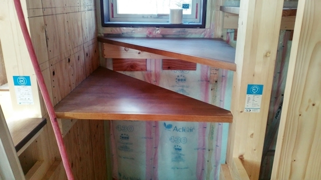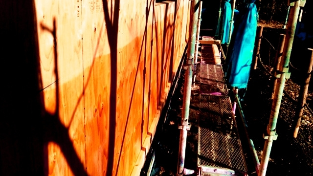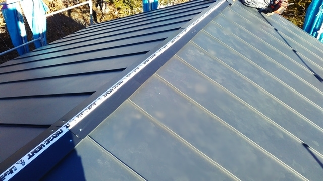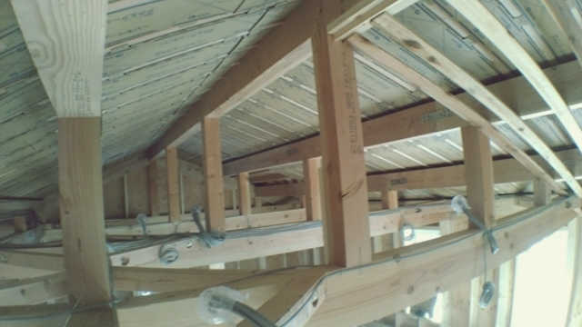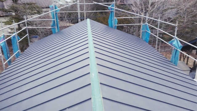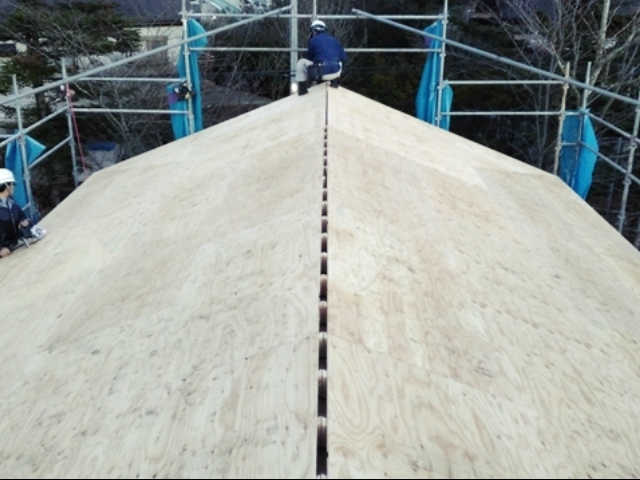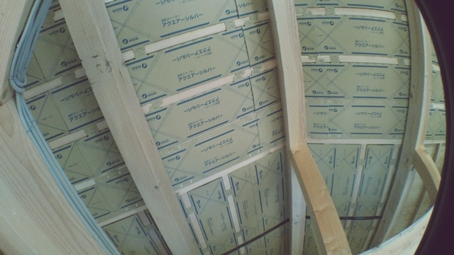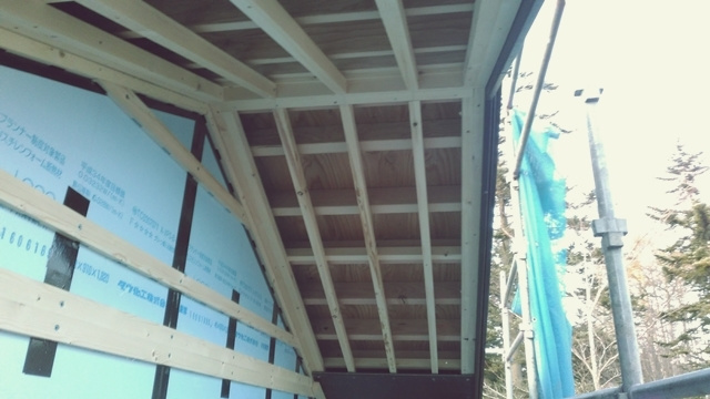 頂上から見下ろすと、屋根垂木が見えます。垂木の間を空気が通って来るというメカニズムです。もちろん、このままでは雨漏りしてしまうので、最終的にはこの上に笠木と呼ばれる被せ物が設置されます。