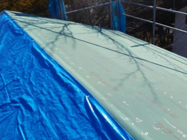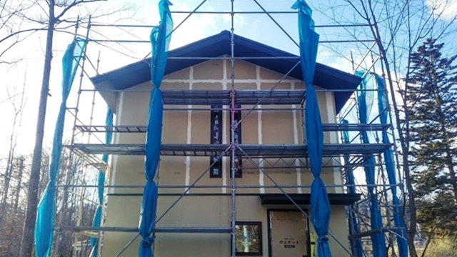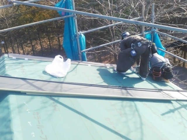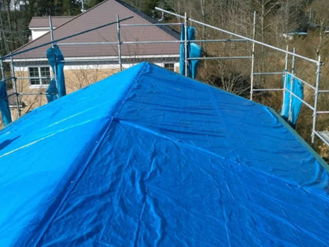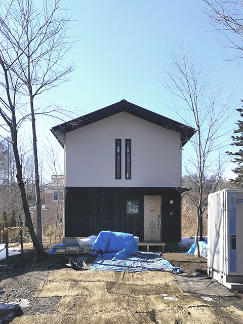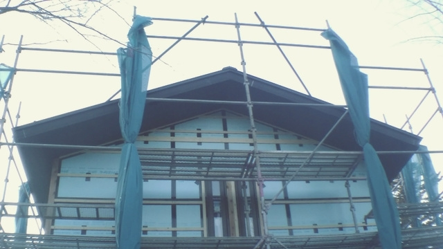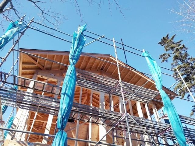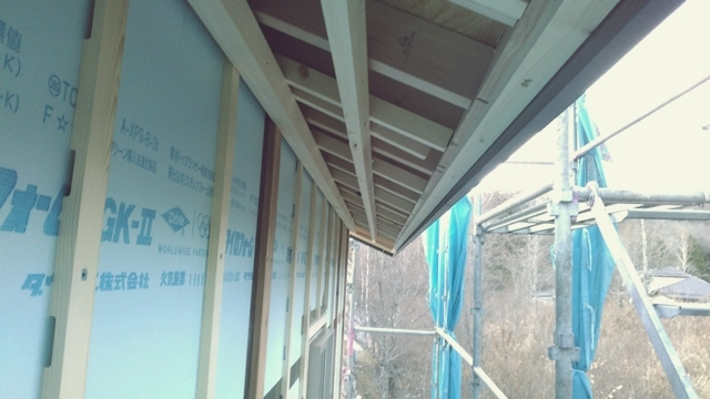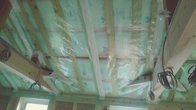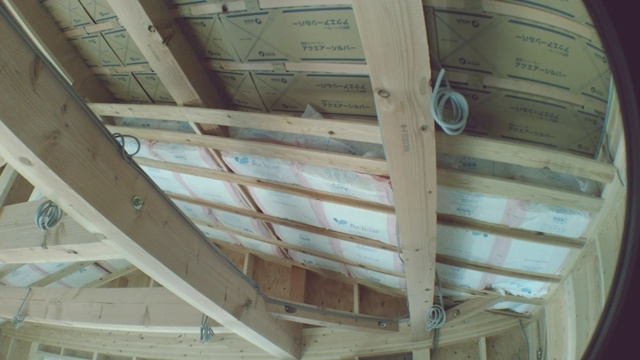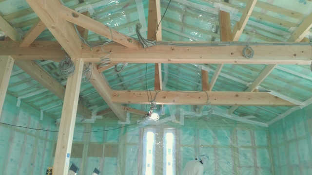 断熱材を貼り終えた後に、室内の湿度が断熱材まで到達しないよう、厚手の防湿フィルムを施工しています。このひと手間を行うことで屋根内部の結露を防ぐことが可能になります。寒い軽井沢での家づくりには必須のひと手間です。
