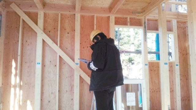 第三者機関による構造躯体の検査を受けました。構造計算時に設計されたとおりに施工されているかを厳しい目で検査して頂きます。柱や梁の位置はもちろんのこと、それらを緊結するボルト等の金物も計画通りに配置されているかをチェックしています。