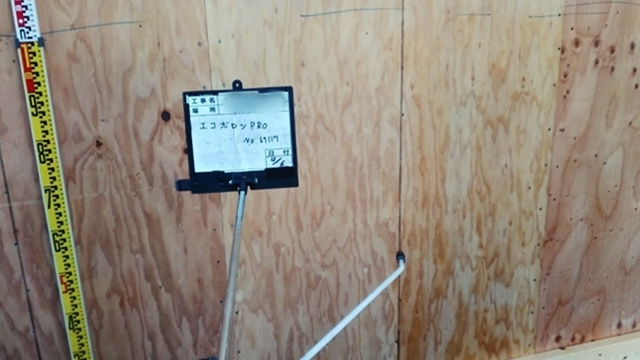 構造躯体の検査も滞りなく終え、午後からは防蟻剤の施工を行っています。今回使用する防蟻材はホウ酸タイプのものです。シロアリに対して半永久的に効果があり、自然由来のホウ酸を使用しているので小さな子どもが住む家でも安心です。入念に塗布をしていきます。