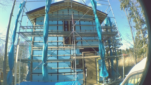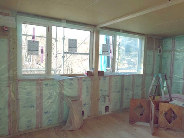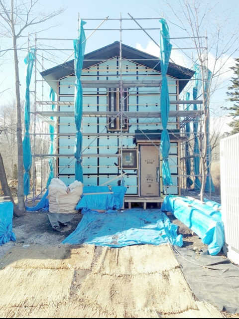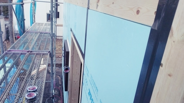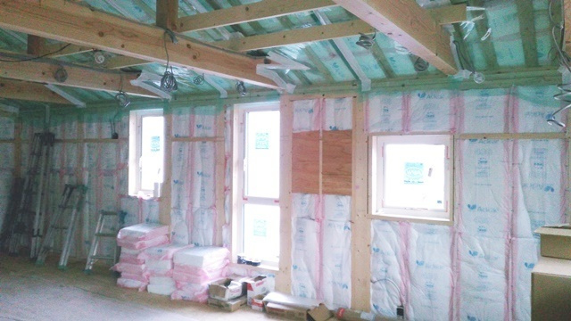屋根に続き、壁の断熱材も施工が完了しました。壁は外側から板状の断熱材を、内側から綿状の断熱材を敷き詰めるハイブリッドな断熱仕様としています。隙間なく、みっちりと断熱材が入っています。