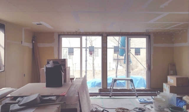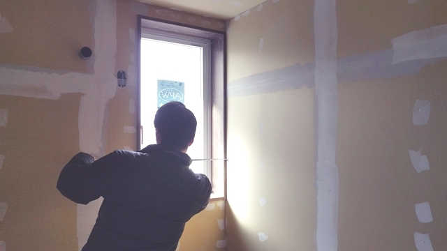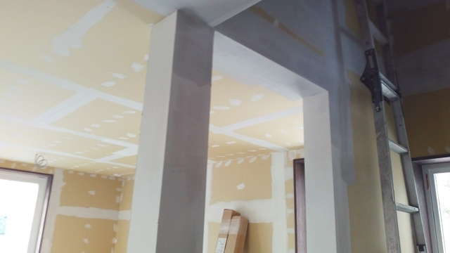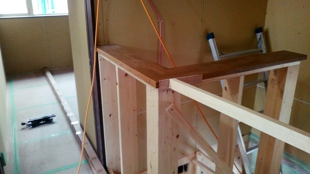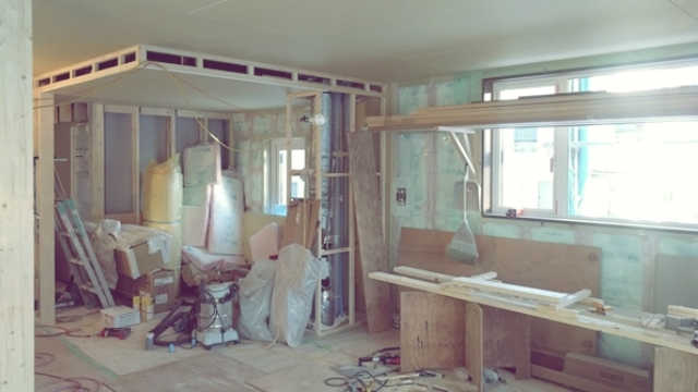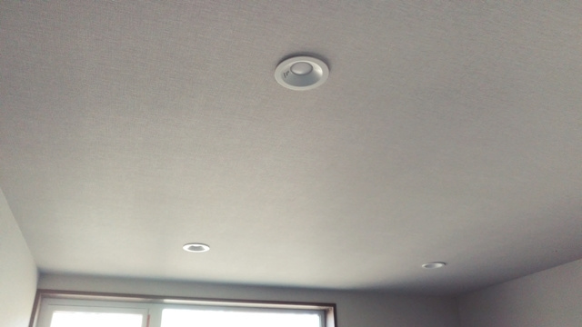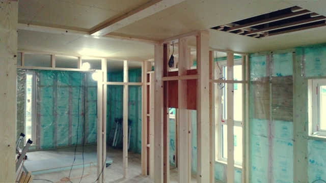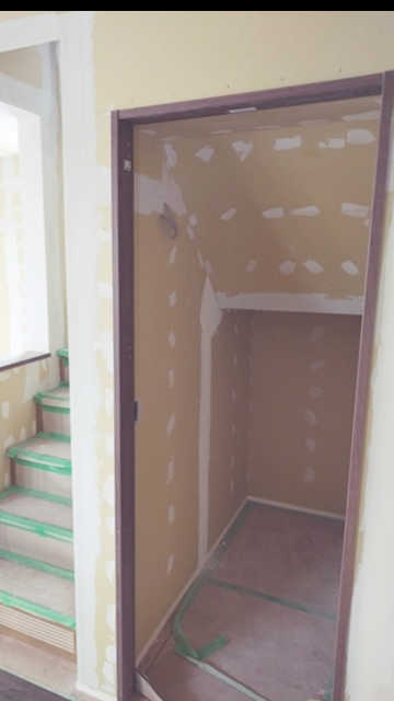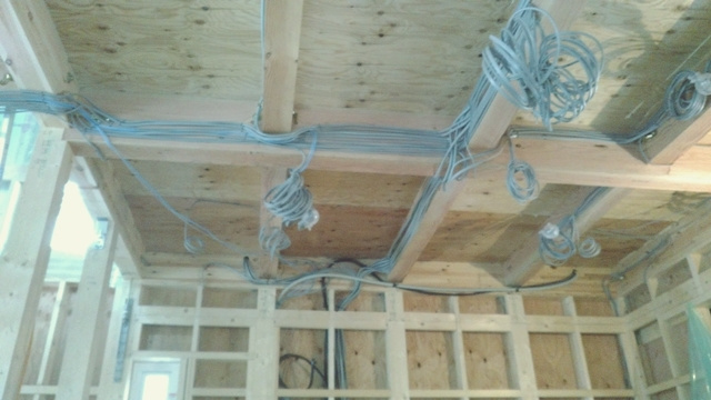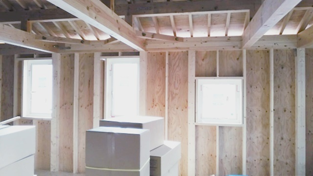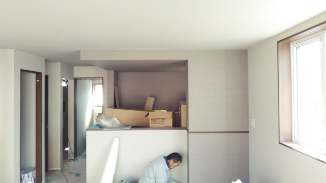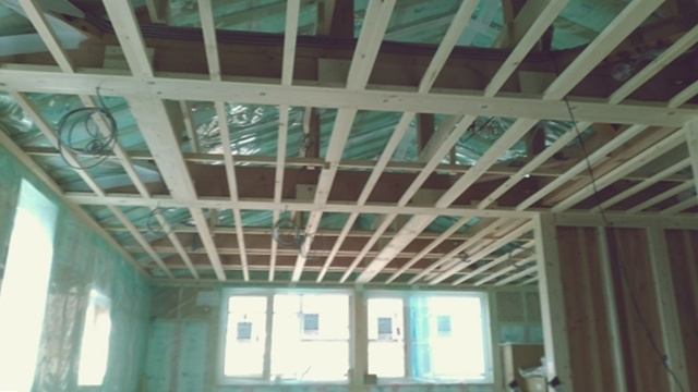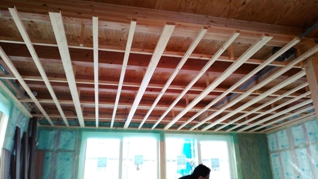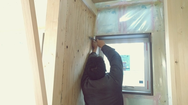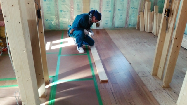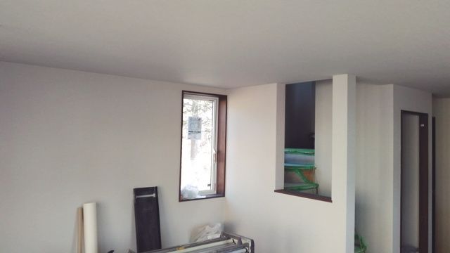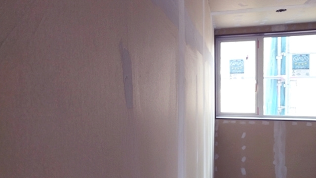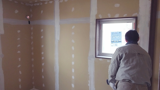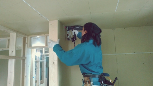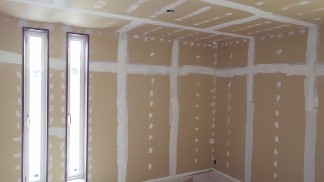 2階の子供部屋の石膏ボードを貼っています。空気圧でビスを出す特殊な道具を使用して、パシパシパシとリズミカルにビスで固定しています。あっという間に子供部屋が石膏ボードで覆われました。