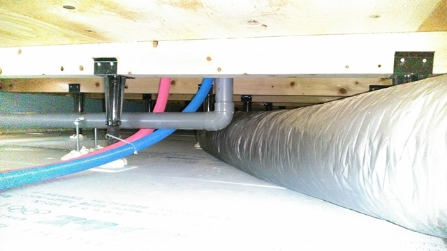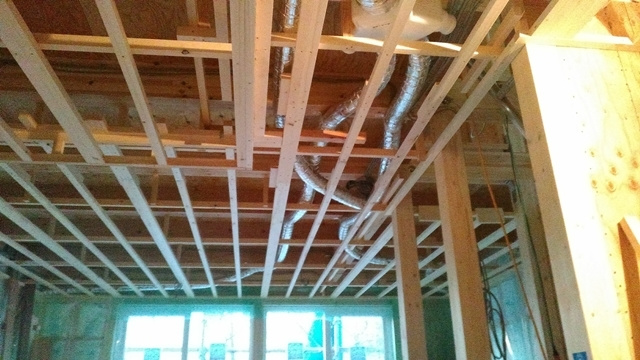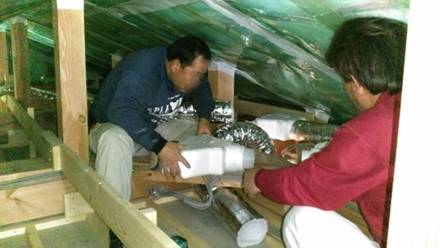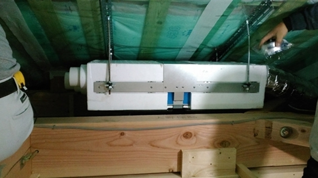 換気システムの本体から枝分かれしたダクトが天井裏を通って建物の各所に配置されています。このシステムはO様邸の様に緻密な温熱計算を行った上に設置する事で、本来の効果を発揮しますので、使いこなせるビルダーはごく僅かです。