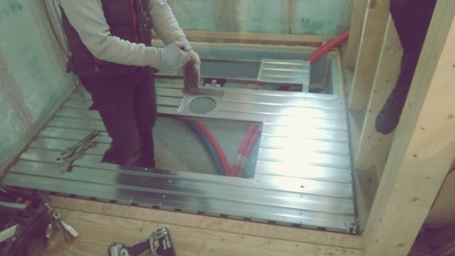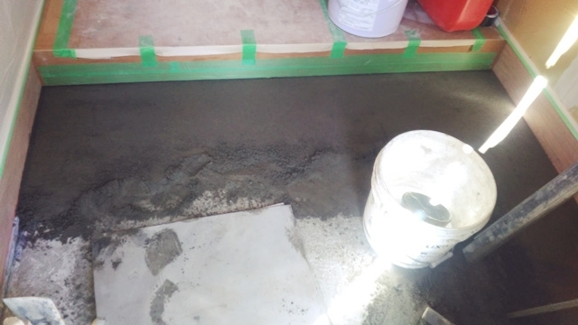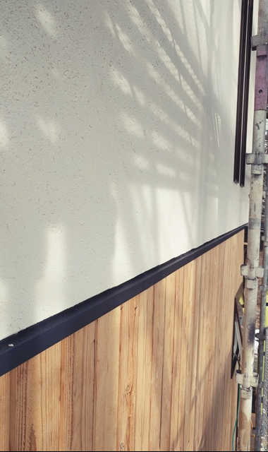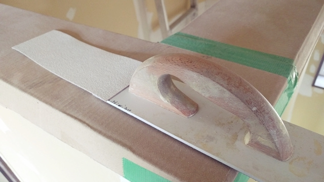 玄関ではタイル貼り下地工事が進行中です。”バサモル”と呼ぶ材料を下地材に使用します。バサモルとは通常のモルタルよりも水分を少なくして不陸調整をし易くした材料です。通常よりもバサバサしているモルタルなので”バサモル”と呼ぶそうです。職人さんは皆バサモルと呼んでいます。