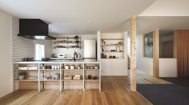 約100㎡と比較的コンパクトな建物ですが、動線に深慮して広いところ、狹いところ、高いところ、低いところ、明るいところ、暗いところといったように緩急の変化をつけることで居場所が生き生きと浮かびあがり、コンパクトな家でも廊下の面積を極力抑えて広々と感じる家にすることができます。