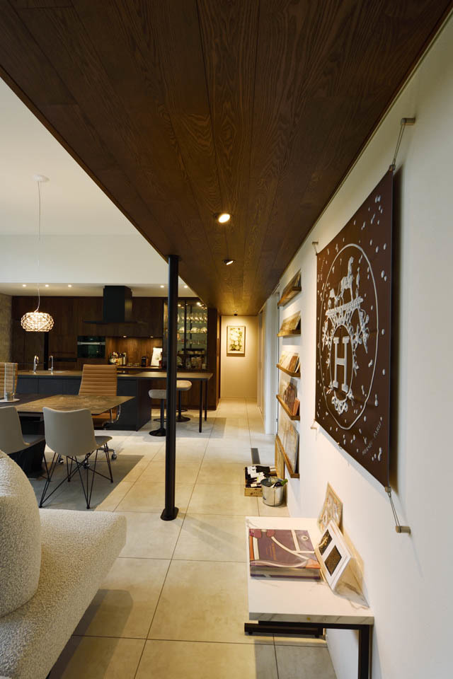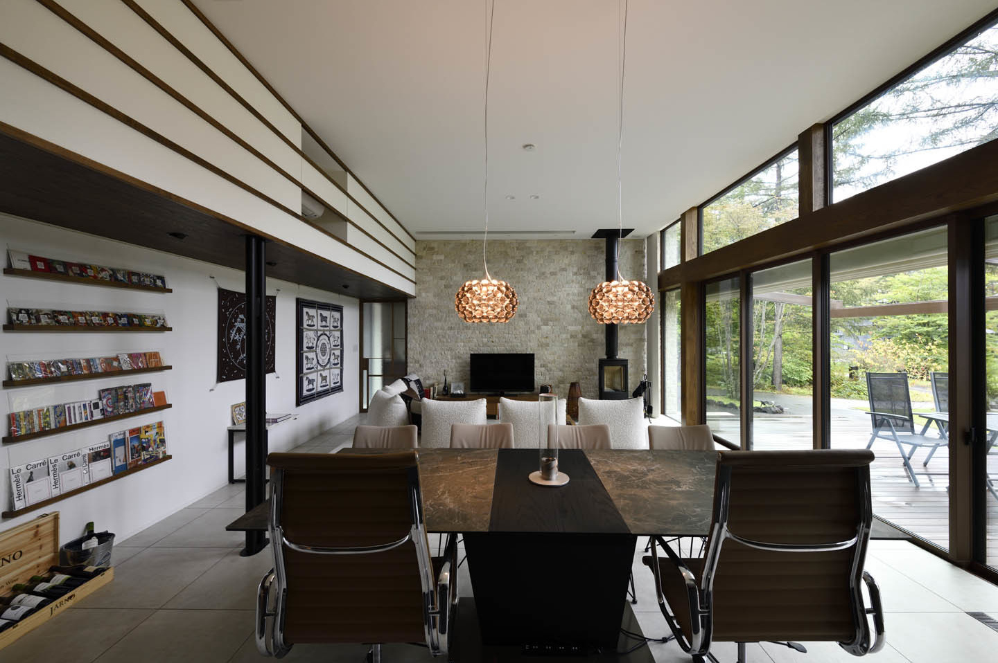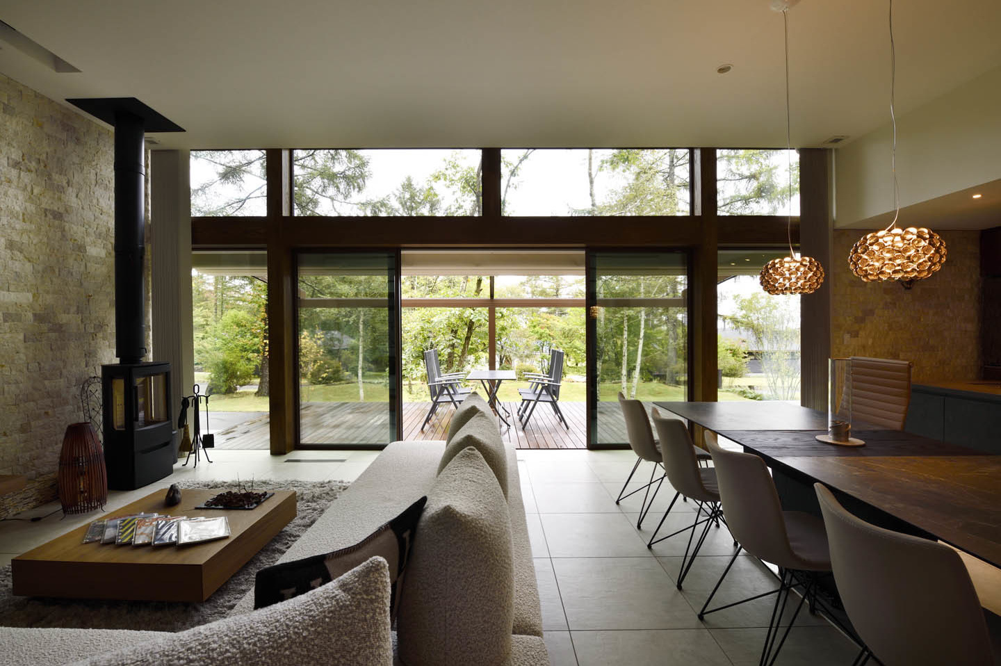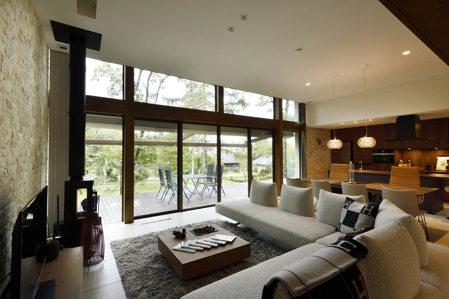 開放的なリビングでありながら、断熱等級は6を実現しており、開放感と快適性を両立した別荘建築です。