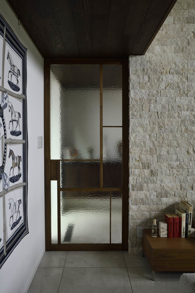 リビングへの入り口は型ガラスで造った引き戸を採用。