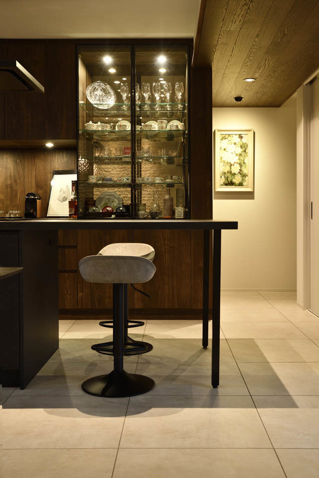 キッチンカウンターと一体になったバーカウンターのようなスペースが特徴的なキッチンです。