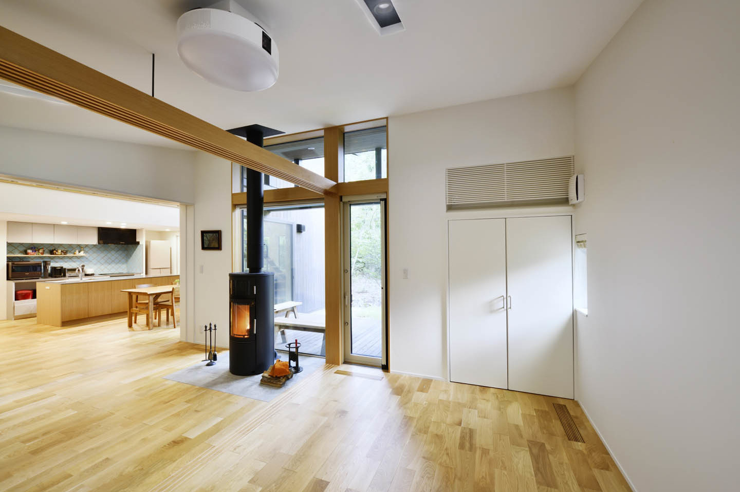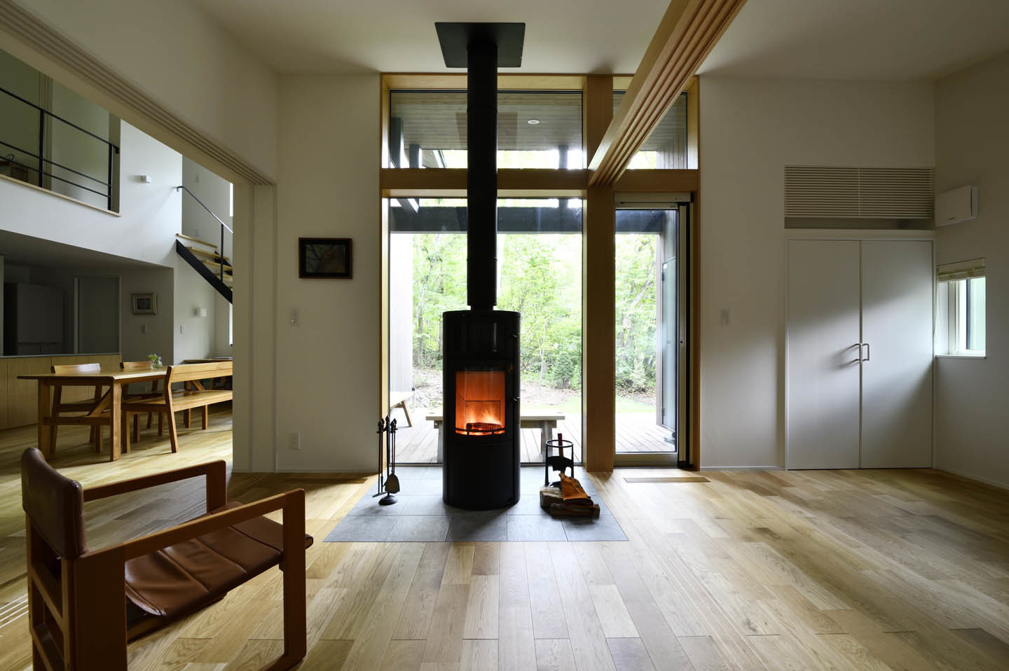 ダイニングに隣接したリビング空間には窓前に薪ストーブが。