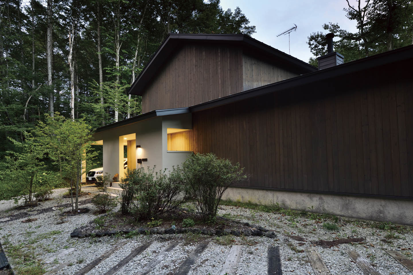 外観は木板と左官仕上げの2種の組み合わせとして落ち着いた印象に。窓は道路面にできるだけ見えないように配慮し、2階の切妻屋根と横に長い1階の屋根が印象的なシンプルなファサードです。