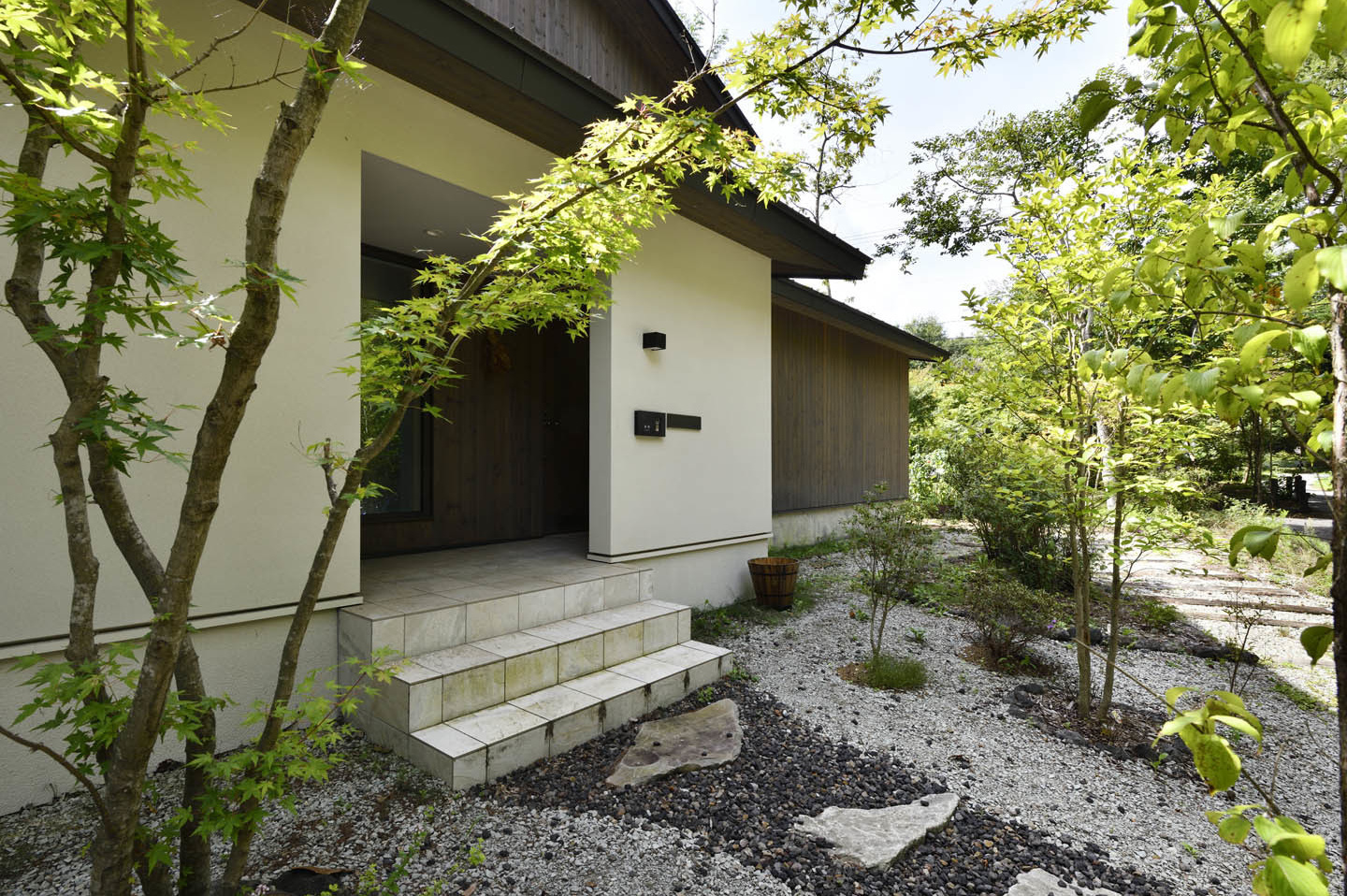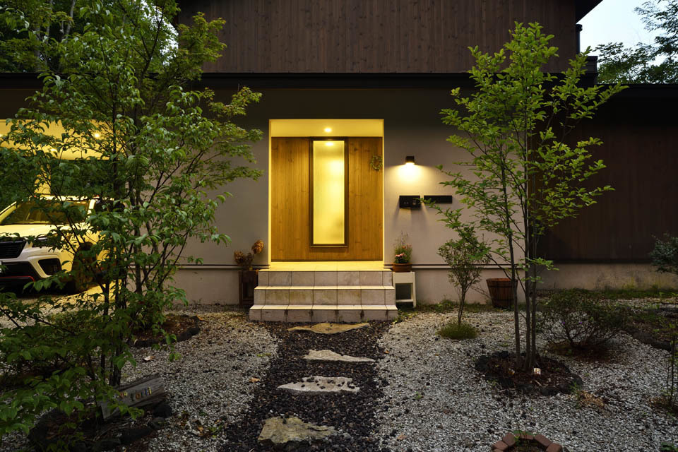 アプローチには様々な樹木が立ち並びます。ステップは自然石。