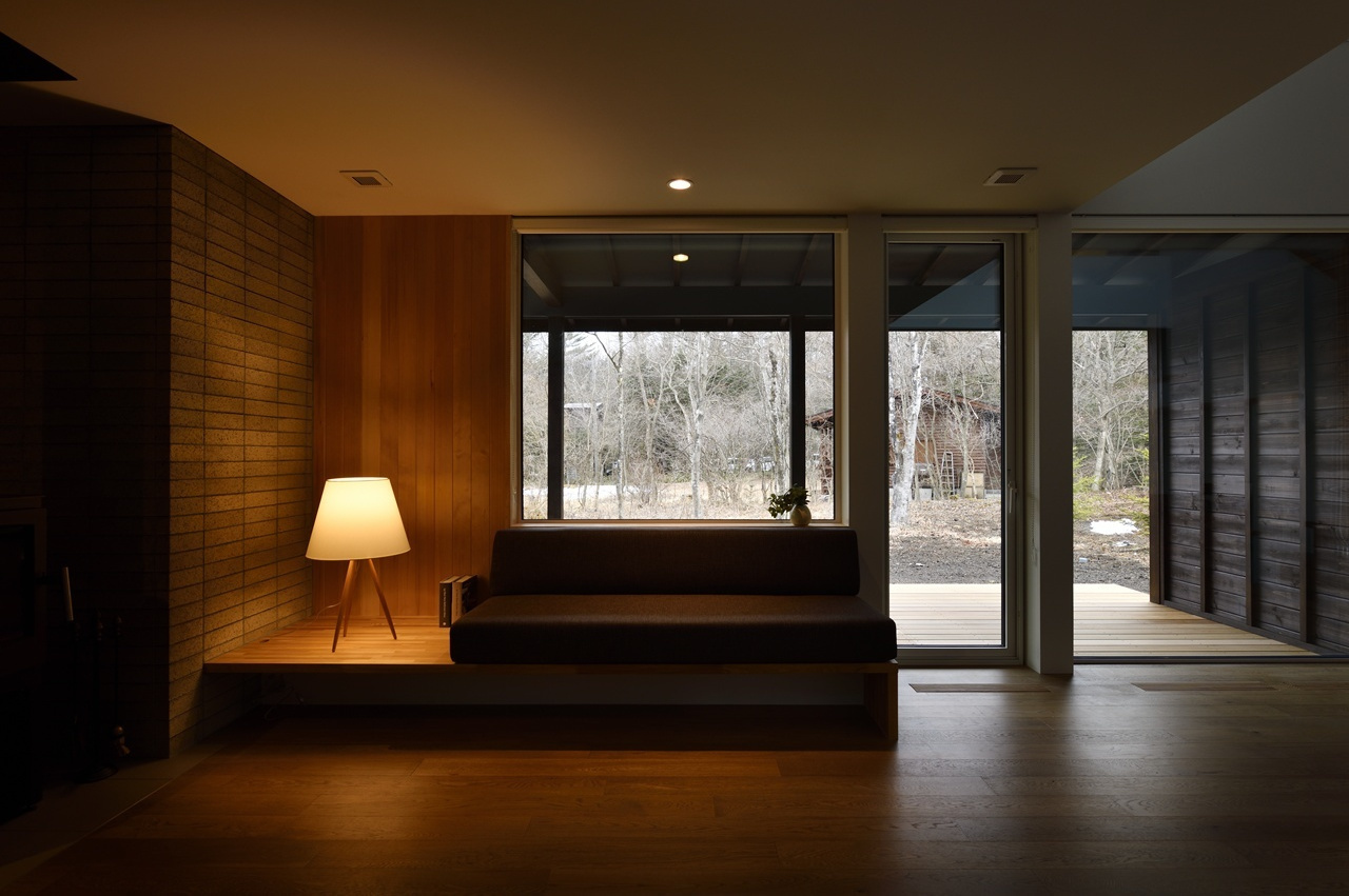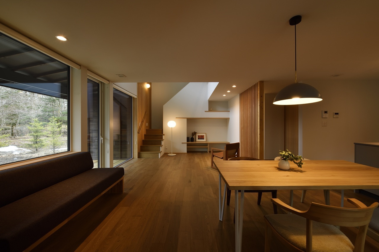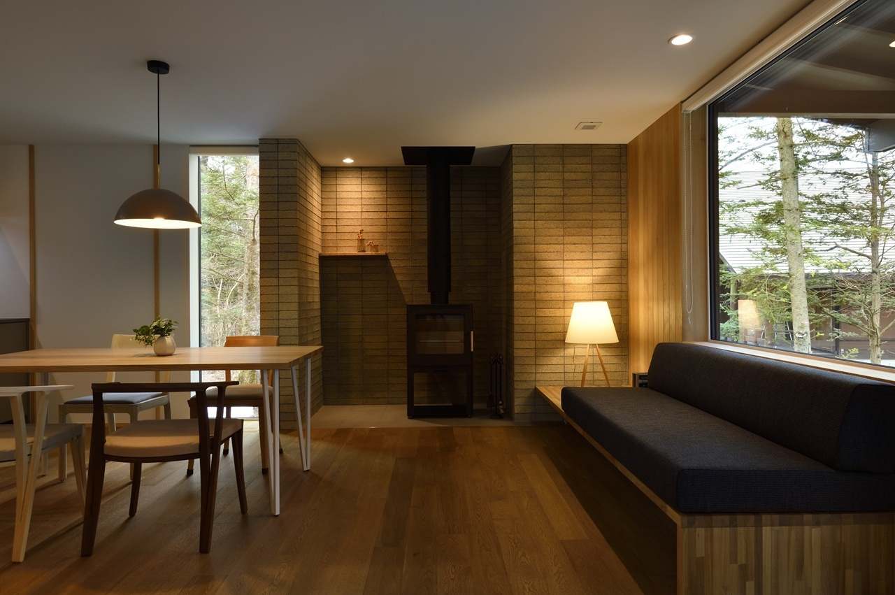 寒さを気にすることなく、軽井沢の四季折々の魅力を存分に堪能していただくために、デザインと温熱環境の調和を徹底的に追求しました。美しい意匠の中に、最先端の断熱技術と自然エネルギー利用の工夫を織り込み、厳冬期でもエアコン一台で足元から優しく暖まる、驚くほどの快適性を実現しています。