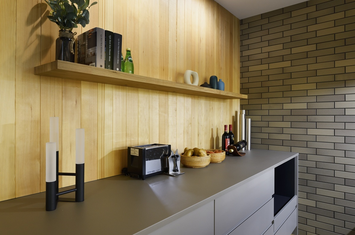 繊細な表情を持つパンチングメタルの面材が、空間全体をより広く感じさせる効果も生み出します。