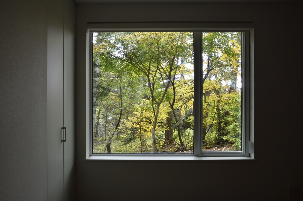 リビングのソファ背面の窓は、深く座った時の視線に合わせて自然を捉え、控えめな大きさにすることで道路の往来からの視線を遮ります。