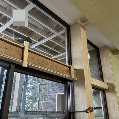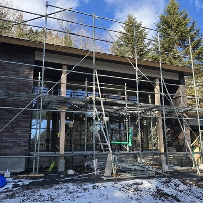 外部の仕上げも進んでいます。タイルと左官の仕上げができ、木枠を塗装します。 ガス暖炉を設置しました。周りの仕上げはタイルなので、ここから下地で囲っていきます。 既製品枠と間仕切り壁の作業が進んでいます。各部屋の形や大きさが見えてきました。 内部の化粧材を取り付けています。 フローリング張りの様子です。 肌触りの良い綺麗なフローリング材です。傷にならない様に養生をしながら進んでいます。 外壁の下地サイディングが完了しました。 外壁の下地になるサイディングを張っています。 軒天下地を取り付けています。 外壁の通気胴縁を取り付けました。外壁の断熱材や気密処理が見えるのはこの段階が最後になります。 断熱材施工完了後シートを張り、2階の天井下地を組んでいます。 玄関ドアを取付けました。外壁の仕上がり位置を元に左右と高さの位置を調整してしっかりと固定します。 外貼り断熱も進んでいます。外壁全面に貼り付け、防水気密テープを全ての隙間と木部に貼り付けます。 床下の断熱を施工しました。厚い断熱材を隙間なく全面に敷き込んでいます。床束周りにも断熱材を充填しています。 屋根板金屋根板金を取付けています。 破風(はふ)破風板を取付けています。斜め破風です。 2層目垂木屋根として見える2層目の垂木と野地を施工しています。 屋根断熱1層目の屋根の上に屋根断熱を敷き詰め、防水気密テープで隙間なく止めていきます。 1層目垂木(たるき)1層目垂木を並べ、野地板を敷いていきます。 建て方(たてかた)建て方の様子です。建物の大きさが見えてきました。 足場仮設足場を建てました。 材料プレカットされた構造材が搬入されました。 基礎完了外周を埋め戻して基礎工事が完了しました。 立上り部分を打設しました。 立上りの型枠を組みました。 ベースを脱型し、立上り部分の枠を組むための墨を出していきます。 ベースを打設しました。 基礎の鉄筋が組まれました。 捨てコンに墨を出し、ベースの枠を組んでいます。 捨てコンを打設しました。 墨出しに必要となる捨てコンクリートを打設するための枠を設置しました。 砕石を敷き、転圧して締め固めます。 基礎工事が始まりました。 基礎工事の段取りが始まりました。測量で出した建物位置を基に丁張を設置していきます。 杭頭処理の様子です。指定の高さで均して仕上げます。 杭打ちの様子です。直径60cmの杭を着々と打っていきます。 試験杭箇所の打設深さを確認しています。調査通りの深さに支持層があるかを確認し、打設を開始しました。 試験杭を打っています。今回はくし兵衛工法というコンクリート杭を打設する方法で行っています。 測量したポイントを基に杭を打つ箇所に印を設置しました。 地盤改良のために杭打機が入りました。 別荘地の一角に1戸建ての住まいを建てることになりました。傾斜を活かした素敵な住まいになります。 森の階層の家 工事概要SE構法 2階建て所在地:軽井沢町