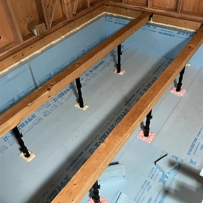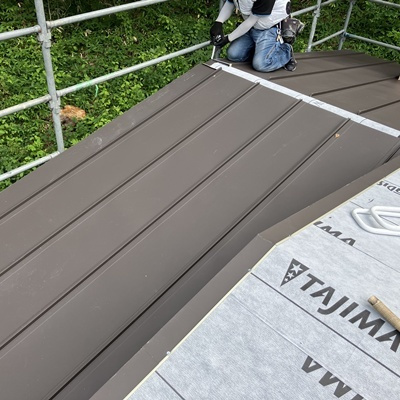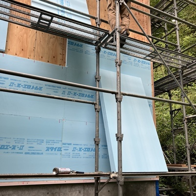 断熱材施工完了後シートを張り、2階の天井下地を組んでいます。 玄関ドアを取付けました。外壁の仕上がり位置を元に左右と高さの位置を調整してしっかりと固定します。 外貼り断熱も進んでいます。外壁全面に貼り付け、防水気密テープを全ての隙間と木部に貼り付けます。 床下の断熱を施工しました。厚い断熱材を隙間なく全面に敷き込んでいます。床束周りにも断熱材を充填しています。 屋根板金屋根板金を取付けています。 破風(はふ)破風板を取付けています。斜め破風です。 2層目垂木屋根として見える2層目の垂木と野地を施工しています。 屋根断熱1層目の屋根の上に屋根断熱を敷き詰め、防水気密テープで隙間なく止めていきます。 1層目垂木(たるき)1層目垂木を並べ、野地板を敷いていきます。 建て方(たてかた)建て方の様子です。建物の大きさが見えてきました。 足場仮設足場を建てました。 材料プレカットされた構造材が搬入されました。 基礎完了外周を埋め戻して基礎工事が完了しました。 立上り部分を打設しました。 立上りの型枠を組みました。 ベースを脱型し、立上り部分の枠を組むための墨を出していきます。 ベースを打設しました。 基礎の鉄筋が組まれました。 捨てコンに墨を出し、ベースの枠を組んでいます。 捨てコンを打設しました。 墨出しに必要となる捨てコンクリートを打設するための枠を設置しました。 砕石を敷き、転圧して締め固めます。 基礎工事が始まりました。 基礎工事の段取りが始まりました。測量で出した建物位置を基に丁張を設置していきます。 杭頭処理の様子です。指定の高さで均して仕上げます。 杭打ちの様子です。直径60cmの杭を着々と打っていきます。 試験杭箇所の打設深さを確認しています。調査通りの深さに支持層があるかを確認し、打設を開始しました。 試験杭を打っています。今回はくし兵衛工法というコンクリート杭を打設する方法で行っています。 測量したポイントを基に杭を打つ箇所に印を設置しました。 地盤改良のために杭打機が入りました。 別荘地の一角に1戸建ての住まいを建てることになりました。傾斜を活かした素敵な住まいになります。 森の階層の家 工事概要SE構法 2階建て所在地:軽井沢町