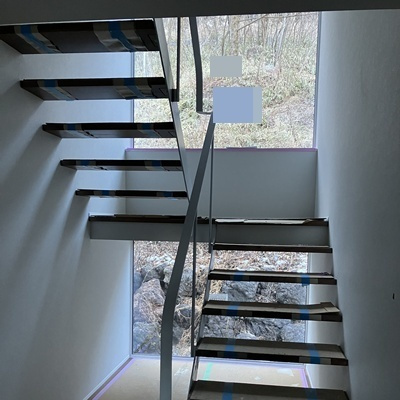 外構工事も着々と進んでいます。石積みと土の搬入が進み、お庭の形が見えてきました。 和室に畳が敷かれました。い草の心地よい香りが広がっています。落ち着いた壁紙の色合いと障子からの程よい光が素敵です。 内部の造作も進んでいます。 パッシブエアコンや冷房用のエアコンを取付けました。配管の凍結防止のためにも試運転を続けていますが、弱めの運転でも中で作業するには暖かすぎるほどよく効いています。 洗面所の様子です。家具やタイル、照明が付き恰好良い仕上りになりました。 浴室の防水工事を行いました。合板下地にFRP防水を施工しています。 鉄骨階段の手すりを取付けました。スリムな手摺なので、取付の際に支えておくのが難しいものでしたが、息を合わせて綺麗に取り付けることができました。 浴室横のテラスができました。加工の難しいセランガンバツ材でしたが、複雑なベンチ部分もうまく仕上がりました。 和室窓外の格子をはめ込みました。あらかじめ仕込んでおいた枠にぴったりと入りました。綺麗な仕上がりです。 外部の仕上げも進んでいます。タイルと左官の仕上げができ、木枠を塗装します。 ガス暖炉を設置しました。周りの仕上げはタイルなので、ここから下地で囲っていきます。 既製品枠と間仕切り壁の作業が進んでいます。各部屋の形や大きさが見えてきました。 内部の化粧材を取り付けています。 フローリング張りの様子です。 肌触りの良い綺麗なフローリング材です。傷にならない様に養生をしながら進んでいます。 外壁の下地サイディングが完了しました。 外壁の下地になるサイディングを張っています。 軒天下地を取り付けています。 外壁の通気胴縁を取り付けました。外壁の断熱材や気密処理が見えるのはこの段階が最後になります。 断熱材施工完了後シートを張り、2階の天井下地を組んでいます。 玄関ドアを取付けました。外壁の仕上がり位置を元に左右と高さの位置を調整してしっかりと固定します。 外貼り断熱も進んでいます。外壁全面に貼り付け、防水気密テープを全ての隙間と木部に貼り付けます。 床下の断熱を施工しました。厚い断熱材を隙間なく全面に敷き込んでいます。床束周りにも断熱材を充填しています。 屋根板金屋根板金を取付けています。 破風(はふ)破風板を取付けています。斜め破風です。 2層目垂木屋根として見える2層目の垂木と野地を施工しています。 屋根断熱1層目の屋根の上に屋根断熱を敷き詰め、防水気密テープで隙間なく止めていきます。 1層目垂木(たるき)1層目垂木を並べ、野地板を敷いていきます。 建て方(たてかた)建て方の様子です。建物の大きさが見えてきました。 足場仮設足場を建てました。 材料プレカットされた構造材が搬入されました。 基礎完了外周を埋め戻して基礎工事が完了しました。 立上り部分を打設しました。 立上りの型枠を組みました。 ベースを脱型し、立上り部分の枠を組むための墨を出していきます。 ベースを打設しました。 基礎の鉄筋が組まれました。 捨てコンに墨を出し、ベースの枠を組んでいます。 捨てコンを打設しました。 墨出しに必要となる捨てコンクリートを打設するための枠を設置しました。 砕石を敷き、転圧して締め固めます。 基礎工事が始まりました。 基礎工事の段取りが始まりました。測量で出した建物位置を基に丁張を設置していきます。 杭頭処理の様子です。指定の高さで均して仕上げます。 杭打ちの様子です。直径60cmの杭を着々と打っていきます。 試験杭箇所の打設深さを確認しています。調査通りの深さに支持層があるかを確認し、打設を開始しました。 試験杭を打っています。今回はくし兵衛工法というコンクリート杭を打設する方法で行っています。 測量したポイントを基に杭を打つ箇所に印を設置しました。 地盤改良のために杭打機が入りました。 別荘地の一角に1戸建ての住まいを建てることになりました。傾斜を活かした素敵な住まいになります。 森の階層の家 工事概要SE構法 2階建て所在地:軽井沢町