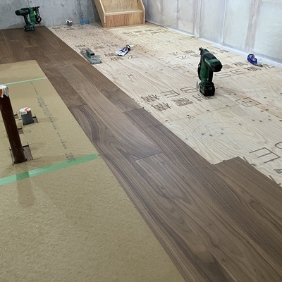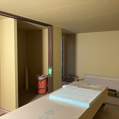 外部の仕上げも進んでいます。タイルと左官の仕上げができ、木枠を塗装します。 ガス暖炉を設置しました。周りの仕上げはタイルなので、ここから下地で囲っていきます。 既製品枠と間仕切り壁の作業が進んでいます。各部屋の形や大きさが見えてきました。 内部の化粧材を取り付けています。 フローリング張りの様子です。 肌触りの良い綺麗なフローリング材です。傷にならない様に養生をしながら進んでいます。 外壁の下地サイディングが完了しました。 外壁の下地になるサイディングを張っています。 軒天下地を取り付けています。 外壁の通気胴縁を取り付けました。外壁の断熱材や気密処理が見えるのはこの段階が最後になります。 断熱材施工完了後シートを張り、2階の天井下地を組んでいます。 玄関ドアを取付けました。外壁の仕上がり位置を元に左右と高さの位置を調整してしっかりと固定します。 外貼り断熱も進んでいます。外壁全面に貼り付け、防水気密テープを全ての隙間と木部に貼り付けます。 床下の断熱を施工しました。厚い断熱材を隙間なく全面に敷き込んでいます。床束周りにも断熱材を充填しています。 屋根板金屋根板金を取付けています。 破風(はふ)破風板を取付けています。斜め破風です。 2層目垂木屋根として見える2層目の垂木と野地を施工しています。 屋根断熱1層目の屋根の上に屋根断熱を敷き詰め、防水気密テープで隙間なく止めていきます。 1層目垂木(たるき)1層目垂木を並べ、野地板を敷いていきます。 建て方(たてかた)建て方の様子です。建物の大きさが見えてきました。 足場仮設足場を建てました。 材料プレカットされた構造材が搬入されました。 基礎完了外周を埋め戻して基礎工事が完了しました。 立上り部分を打設しました。 立上りの型枠を組みました。 ベースを脱型し、立上り部分の枠を組むための墨を出していきます。 ベースを打設しました。 基礎の鉄筋が組まれました。 捨てコンに墨を出し、ベースの枠を組んでいます。 捨てコンを打設しました。 墨出しに必要となる捨てコンクリートを打設するための枠を設置しました。 砕石を敷き、転圧して締め固めます。 基礎工事が始まりました。 基礎工事の段取りが始まりました。測量で出した建物位置を基に丁張を設置していきます。 杭頭処理の様子です。指定の高さで均して仕上げます。 杭打ちの様子です。直径60cmの杭を着々と打っていきます。 試験杭箇所の打設深さを確認しています。調査通りの深さに支持層があるかを確認し、打設を開始しました。 試験杭を打っています。今回はくし兵衛工法というコンクリート杭を打設する方法で行っています。 測量したポイントを基に杭を打つ箇所に印を設置しました。 地盤改良のために杭打機が入りました。 別荘地の一角に1戸建ての住まいを建てることになりました。傾斜を活かした素敵な住まいになります。 森の階層の家 工事概要SE構法 2階建て所在地:軽井沢町